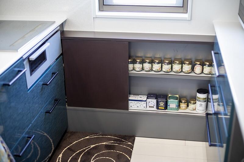 キッチンを対面型にするために、窓下に配管を通すことに。配管スペースを有効利用できるよう、奥行の浅いキャビネットをオプションで追加されました。調味料や紅茶の瓶を置いたりと重宝しているそうです。