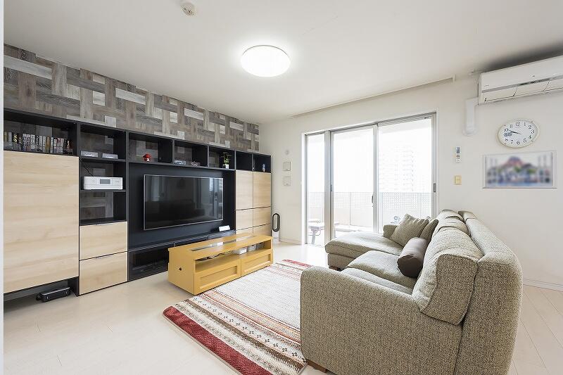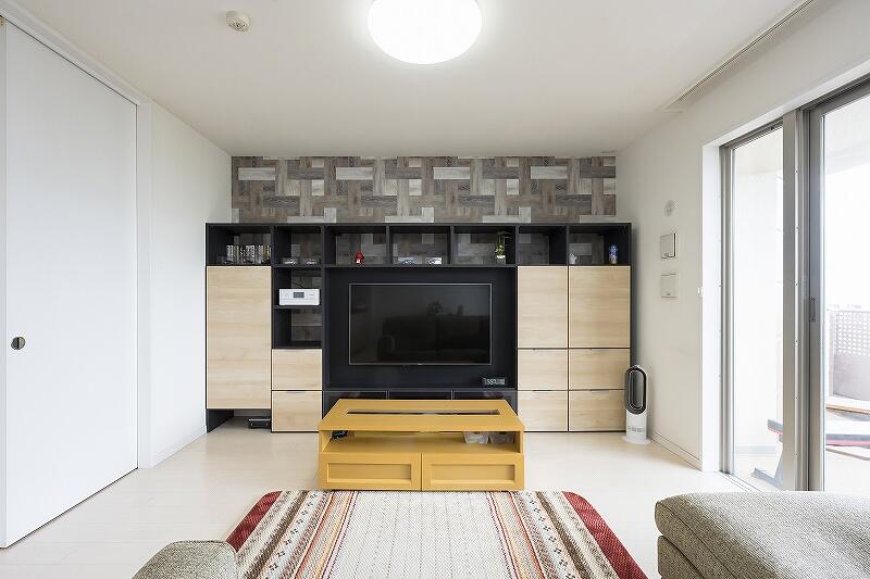 リビング側は、ショールームでご覧になった壁一面のTVボード収納を設置。お気に入りのアクセントクロスが映えるすっきりとした納まりに、とても使いやすくなったとお喜びの声をいただきました。