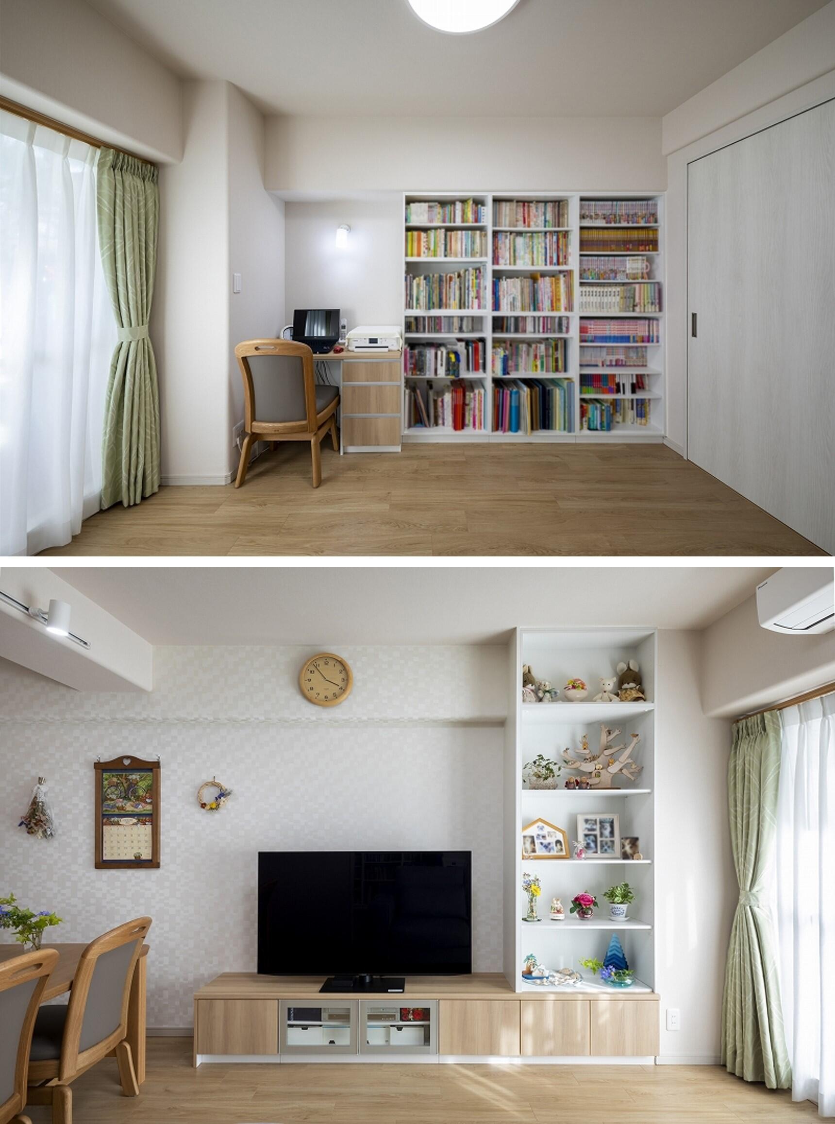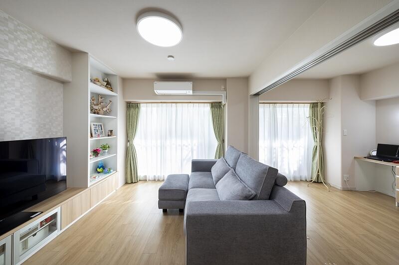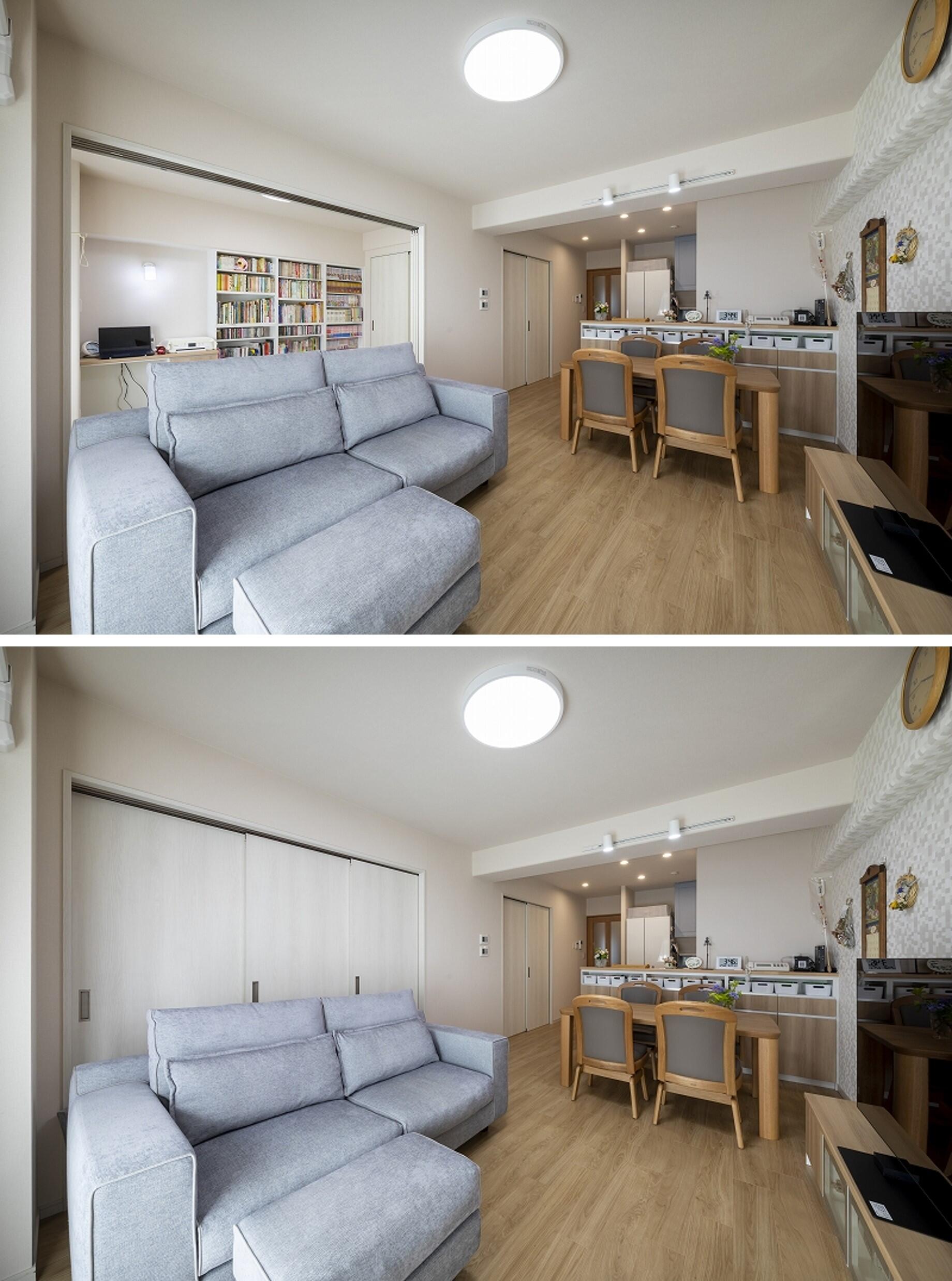 カビ・結露に悩まされていた北側洋室の環境を整えることもご要望のひとつで、換気がしやすいよう各お部屋を引き戸でつなげ南側の窓との風の通り道を作りました。このレイアウトはリフォームならでは。お住まいのマンションでは「うちだけじゃないかなぁ。」と気に入ってくださっています。