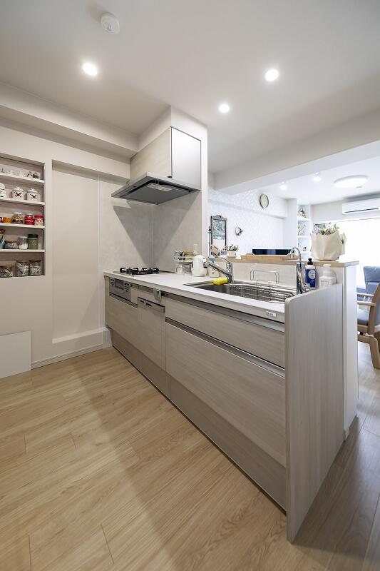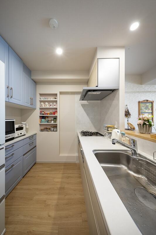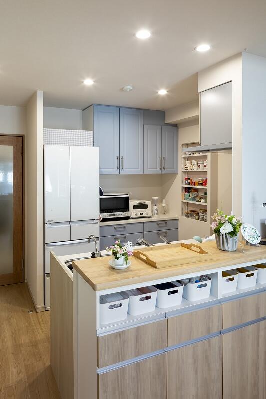 誰かの手を借りなくてはならない生活になっても困らないよう、「どこに何があるのか誰にでも分かりやすくしたい。」とのご要望をカタチにしました。収納が充実したことで「必要なものがすぐ見つかり、足りないものもすぐ分かることでストレス半減。」「準備や片付けに時間がかからなくなった分、ゆっくり好きな事をする時間が増えた。」と喜んでくださっています。