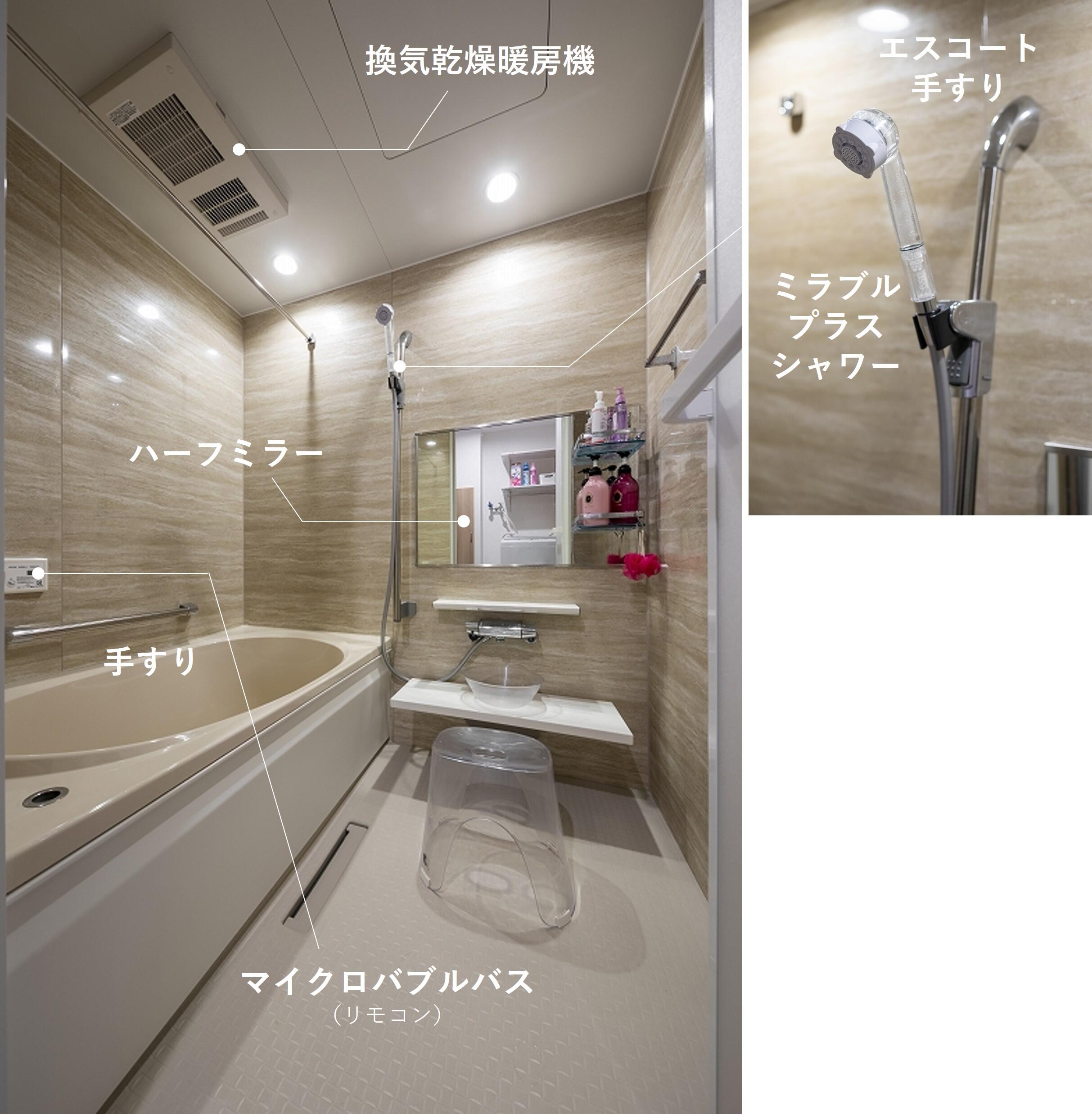 「一日の終わりにゆっくりお風呂に入り、汚れを落としてさっぱりしたい。」と『マイクロバブル』を標準装備した長谷工オリジナル仕様プレミアムシステムバスの採用を決められたY様ご夫妻。『マイクロバブル』で「お湯がまろやか。」、『ミラブルプラスシャワー』で「お肌のお手入れが楽しみになった。」と入浴を楽しまれています。お嬢様も訪問のたびにお風呂に入っていかれるそうです。