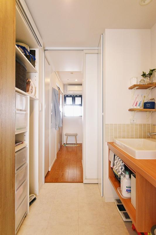 キッチンや洋室の間仕切りを撤去し、水まわりも移設することで、玄関からキッチンに直接行けたり、ストレージを通って洗面室に行けたりと使いやすい動線を確保しました。