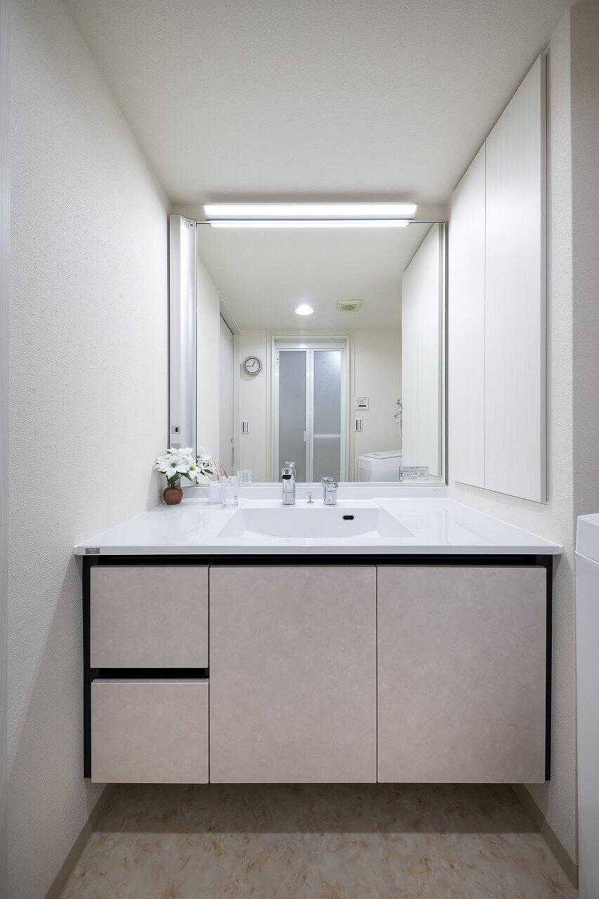 洗面室とトイレには長谷工リフォームオリジナルセミオーダー収納家具RASHIKU(ラシク)をご採用頂きました。ミリ単位でサイズオーダーできるので、「ココ」に置きたい、にピッタリ納まります。