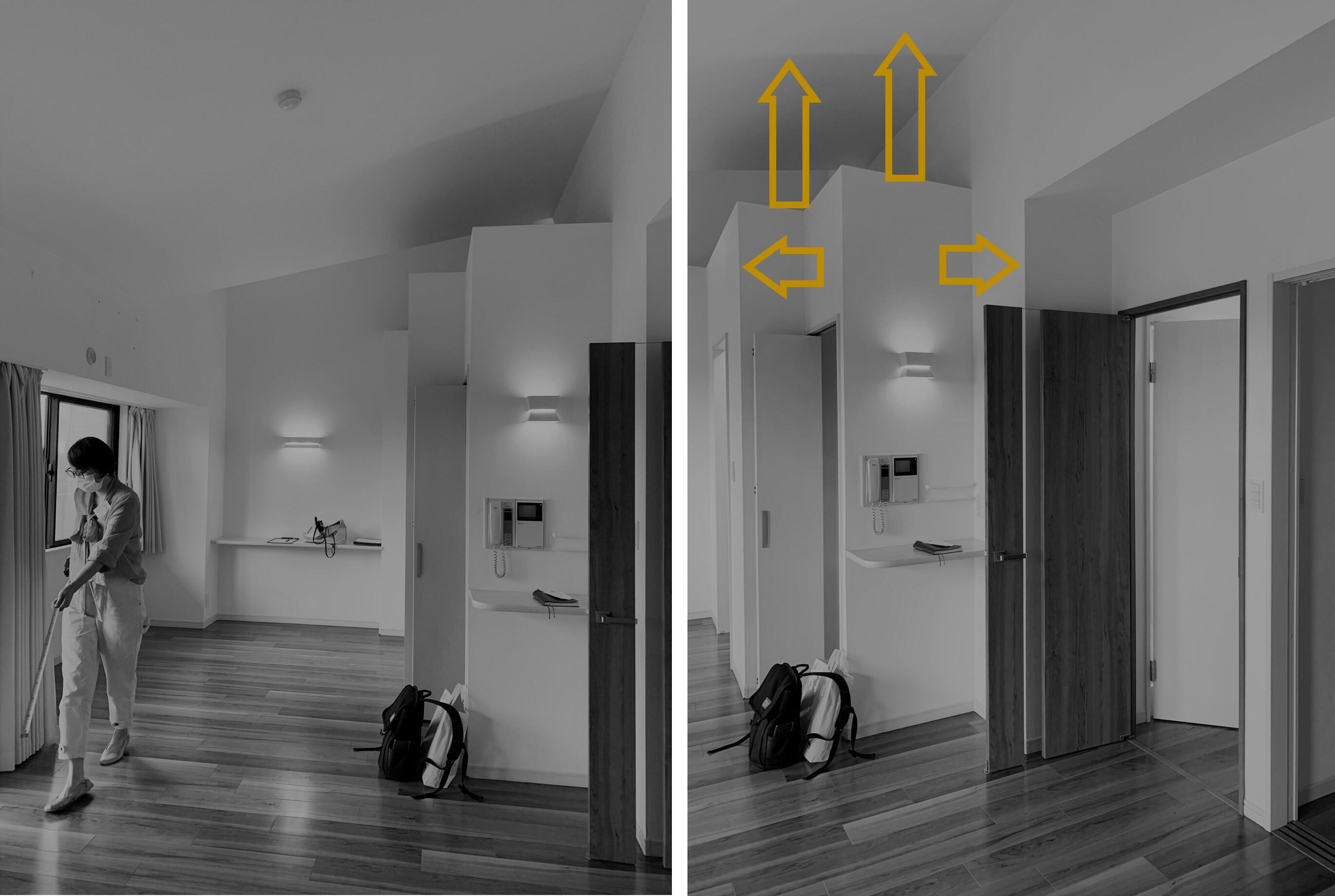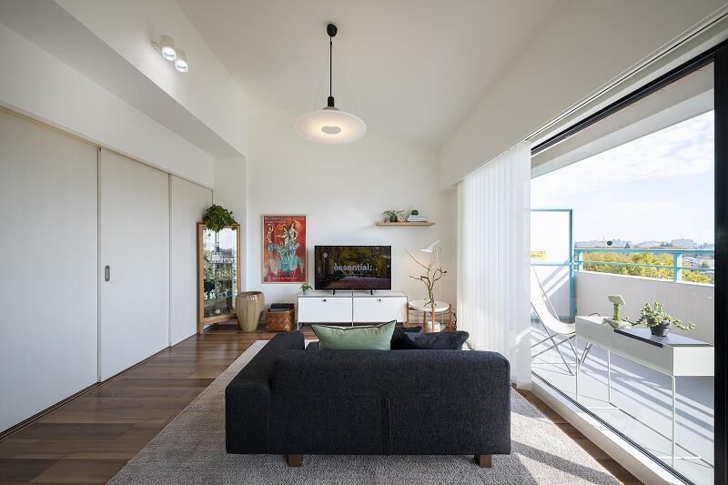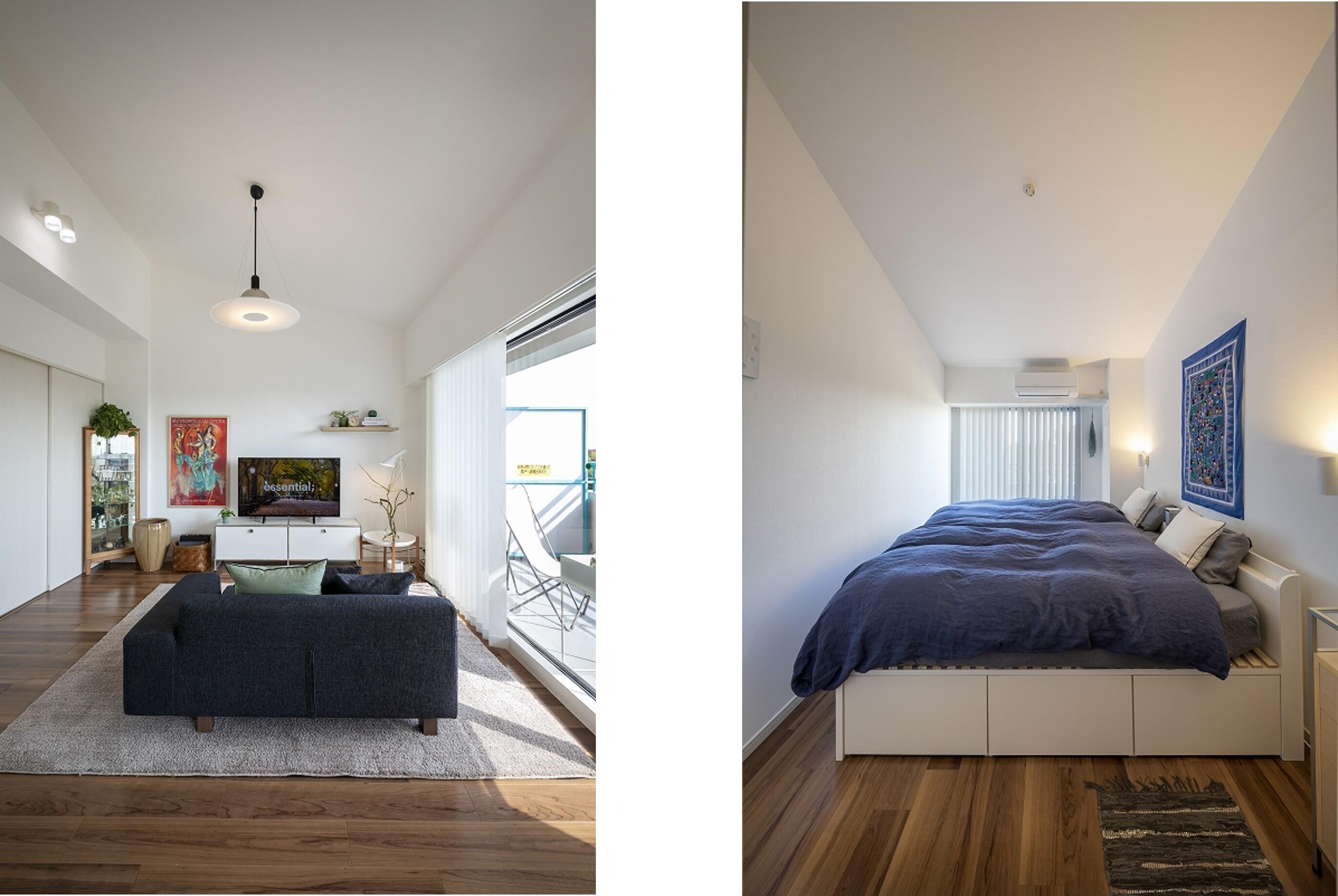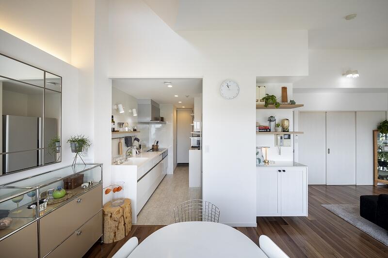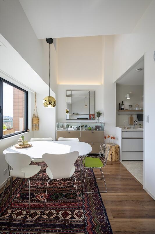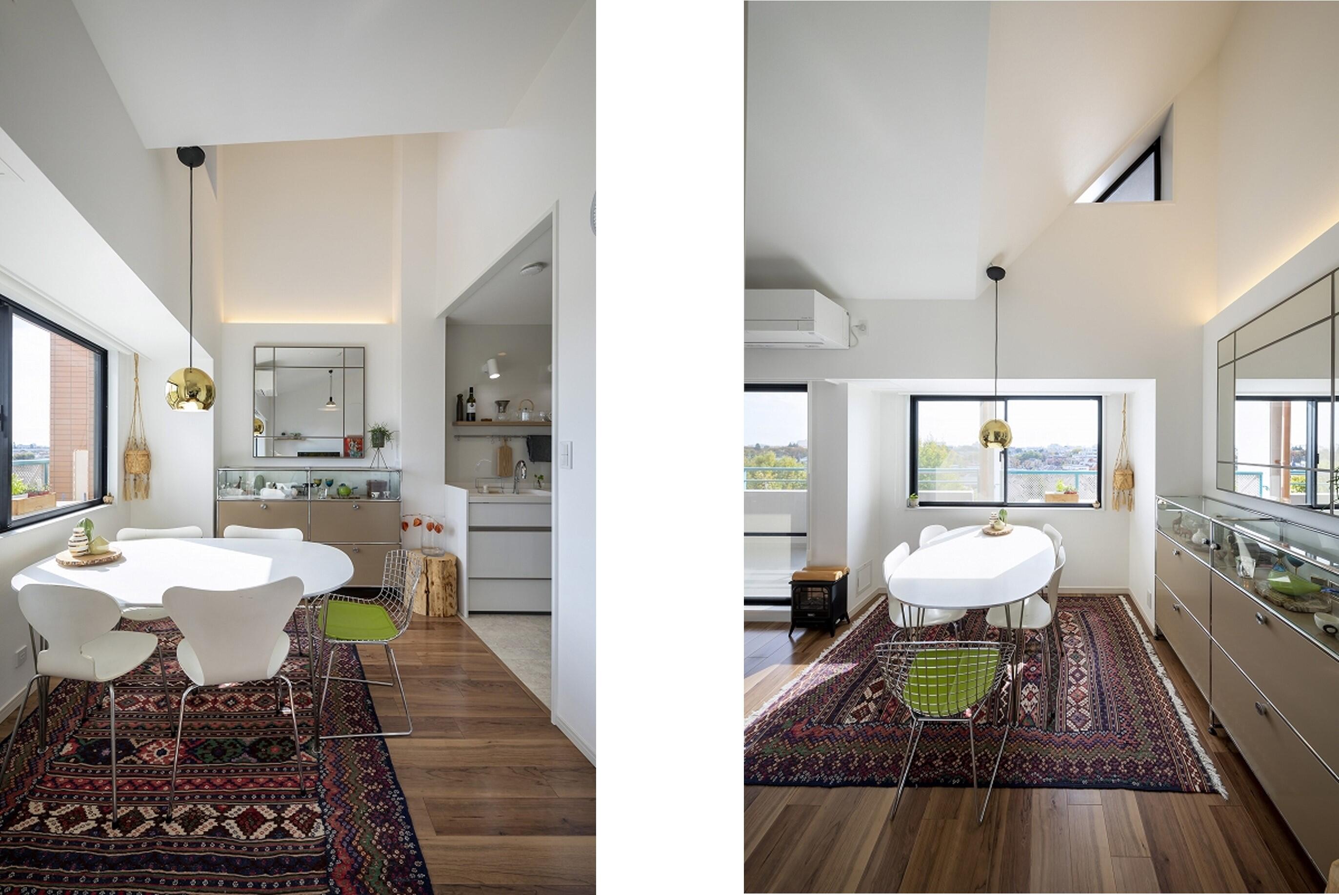 「長谷工が施工したマンションだから」ということでお声掛けくださったG様。傾斜のある高い天井が印象的なペントハウスのようなお部屋を、「自分たちに合った住まいにしたい」と始まったリフォームは、家事動線と収納の整備が大きなテーマでした。