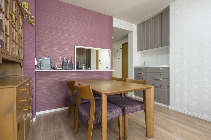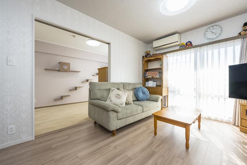 和室を洋室に変更し、その洋室とリビングダイニングの収納を見直し内装を一新するプランを作成。こだわって選びたいとおっしゃっていた壁紙を残し、工事内容・仕様が決まったところで、一緒に暮らす高齢の猫ちゃんが糖尿病と診断され、急遽追加でキャットウォークのご要望をいただきました。「元気で過ごせるように」と猫ちゃんの健康を気遣うT様のあふれる愛にお応えすべく、ペットの足腰に優しくお手入れも簡単と好評の床材も併せて提案し、ご採用いただきました。