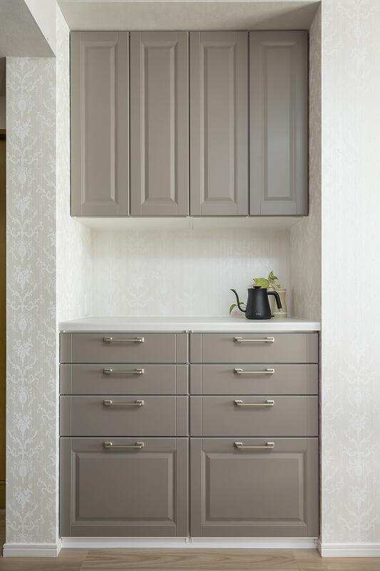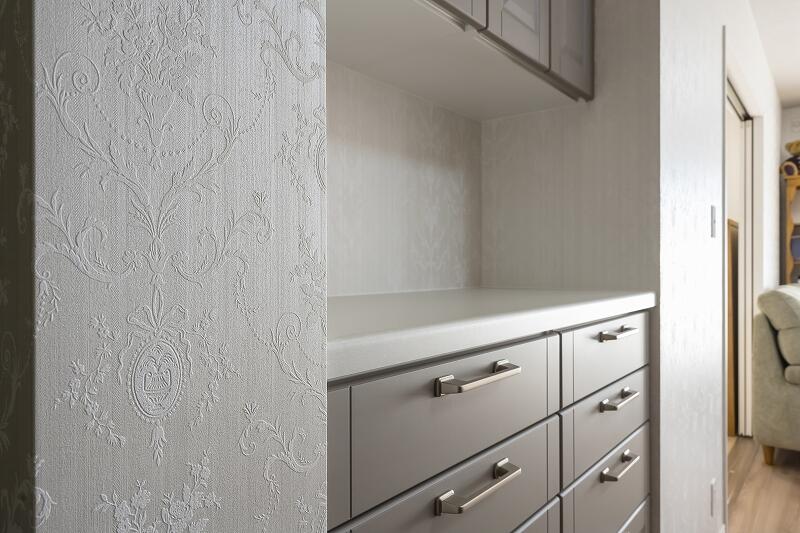 こだわって選ばれた収納棚や壁紙等のエレメントは、どれも個性がありながらもお手持ちの家具との相性がよく、優しく穏やかな空気感があります。T様がイメージされていた『落ち着いて暮らせる空間』に仕上がりました。