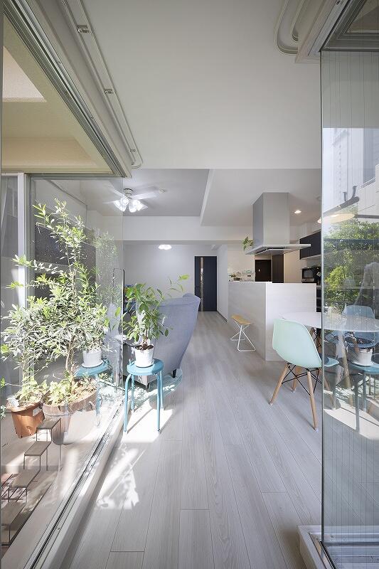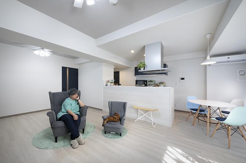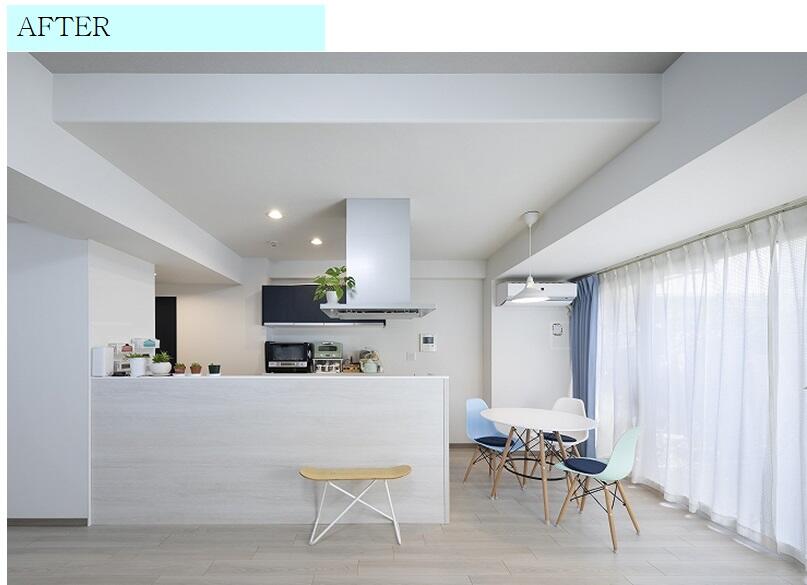 壁に囲まれて孤独を感じていたというキッチンはオープンキッチンに変更し、内装も明るいリゾート風にイメージチェンジ。クリエイティブなお仕事をされているお嬢様と相談し、大胆な柄や濃い色味の壁紙を選ぶなどインテリアコーディネートも楽しまれました。