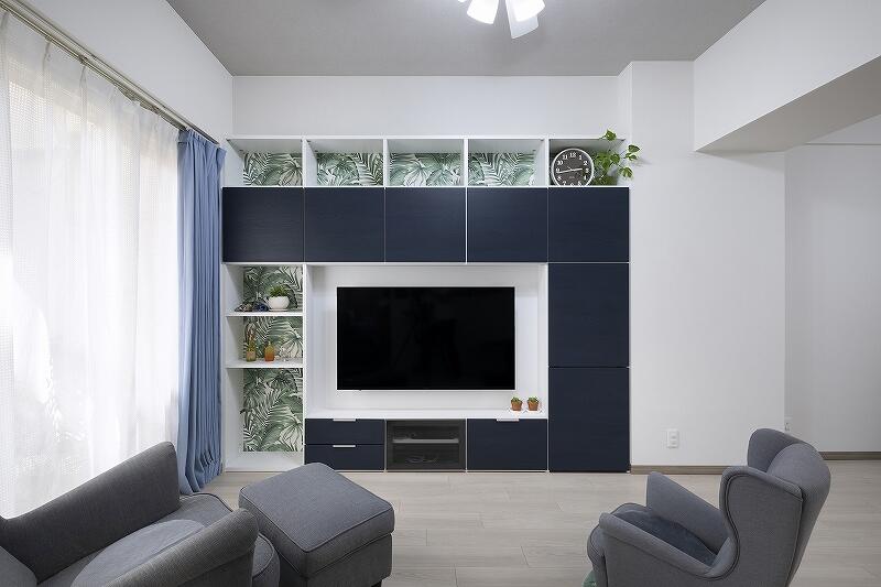 更に、T V収納壁面のお選びになられましたアクセントクロスにより空間全体が一層魅力的にもなりました。