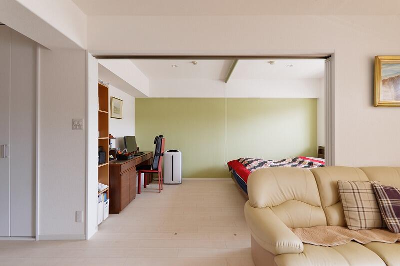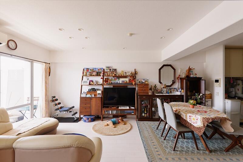 3匹のワンちゃんが暮らすS様邸の床は、お手入れがしやすく小型犬の歩きやすさにも配慮したペットフローリングに変更。明るい床色にお部屋の雰囲気が一新されました。優しいグリーンのアクセントクロス、鮮やかな色味のラグやキルトが映え、ワンちゃんたちとの賑やかな暮らしに彩りを添えてくれています。