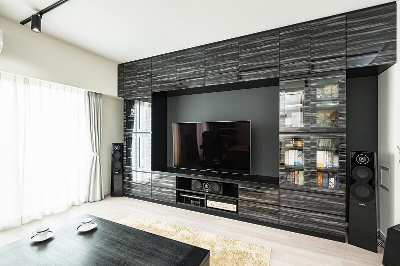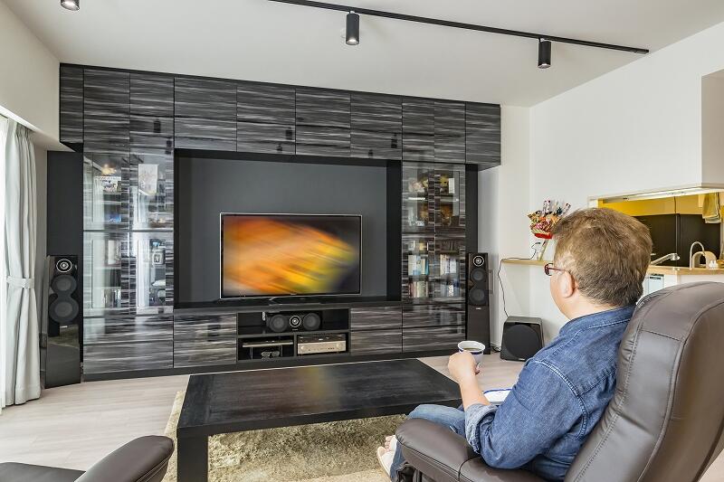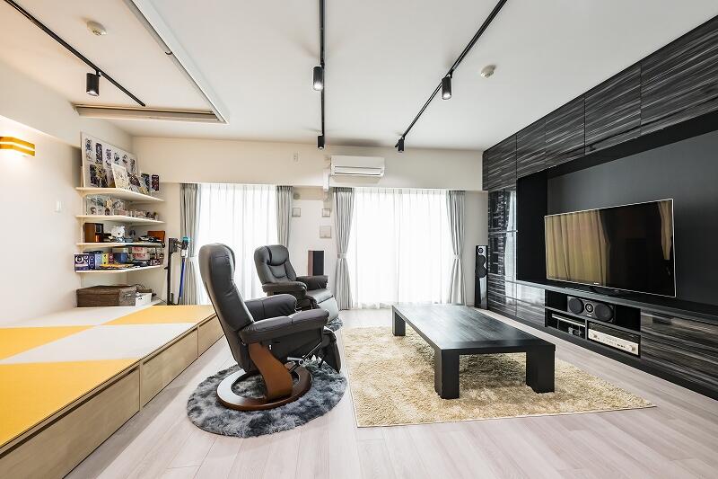 F様の音へのこだわりに応える、スピーカースペースを設けた壁面収納はオーダーメイド。モノトーンの木目がクールな鏡面の扉、抜け感のあるガラス扉、レザー調カウンター、背面にはブラックのアクセントクロスと、デザイン面でもこだわりが感じられます。小上がりの畳は思い切ったカラーで冒険するなど、ひとつひとつ楽しみながらリフォームを進めていかれました。
