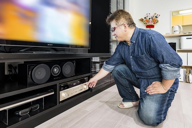 アーティストのライブ映像や映画をご自宅で楽しまれるF様にとって、臨場感あふれる5.1chサラウンドシステムの実現はどうしても外せないポイントでした。スピーカーの配置ありきで壁面収納をデザイン。アンプからの配線は、壁と天井の裏側を通して理想の位置まで引っ張っています。後方スピーカーの場合、アンプから距離があるため露出配線になりがちですが、電気工事のタイミングで配線を行いすっきりと美しく仕上げることが出来ました。