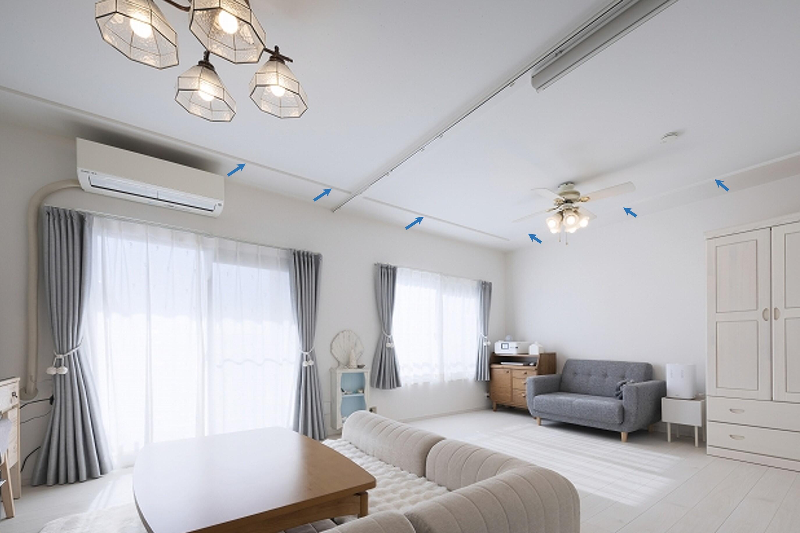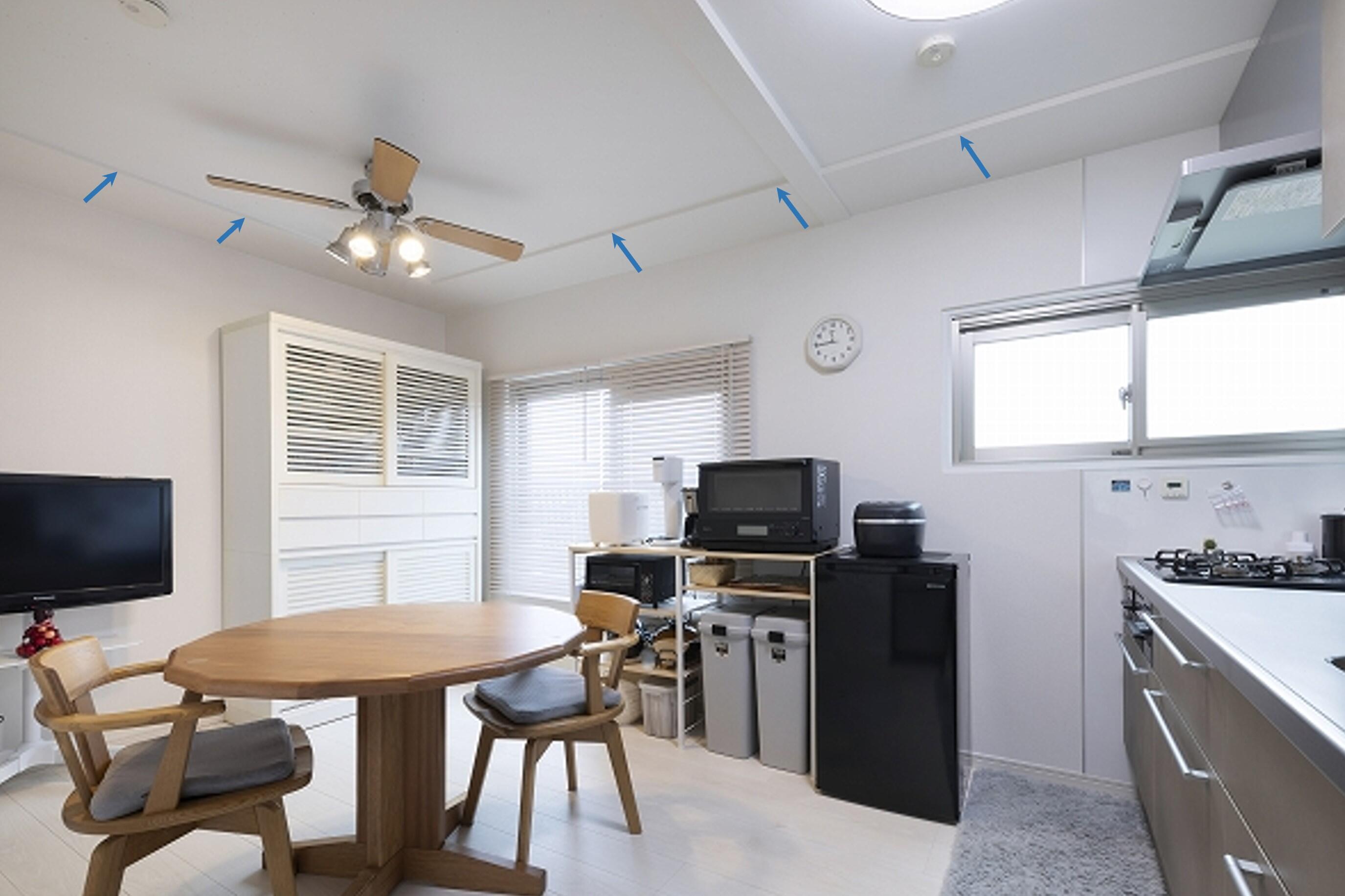結露とカビに悩まされていたT様邸。屋外と接する壁すべてに、断熱材と一体になった内装材を貼る断熱工事を行いました。十分な断熱効果を得るため、天井面にも45cmほど貼り伸ばしています。<画像内 ➡ 参照> これによりに外気の影響を受けにくくなり、冷暖房効率もアップ! 室内の温度が安定し1年中快適に過ごせるようになったと喜んでおられます。