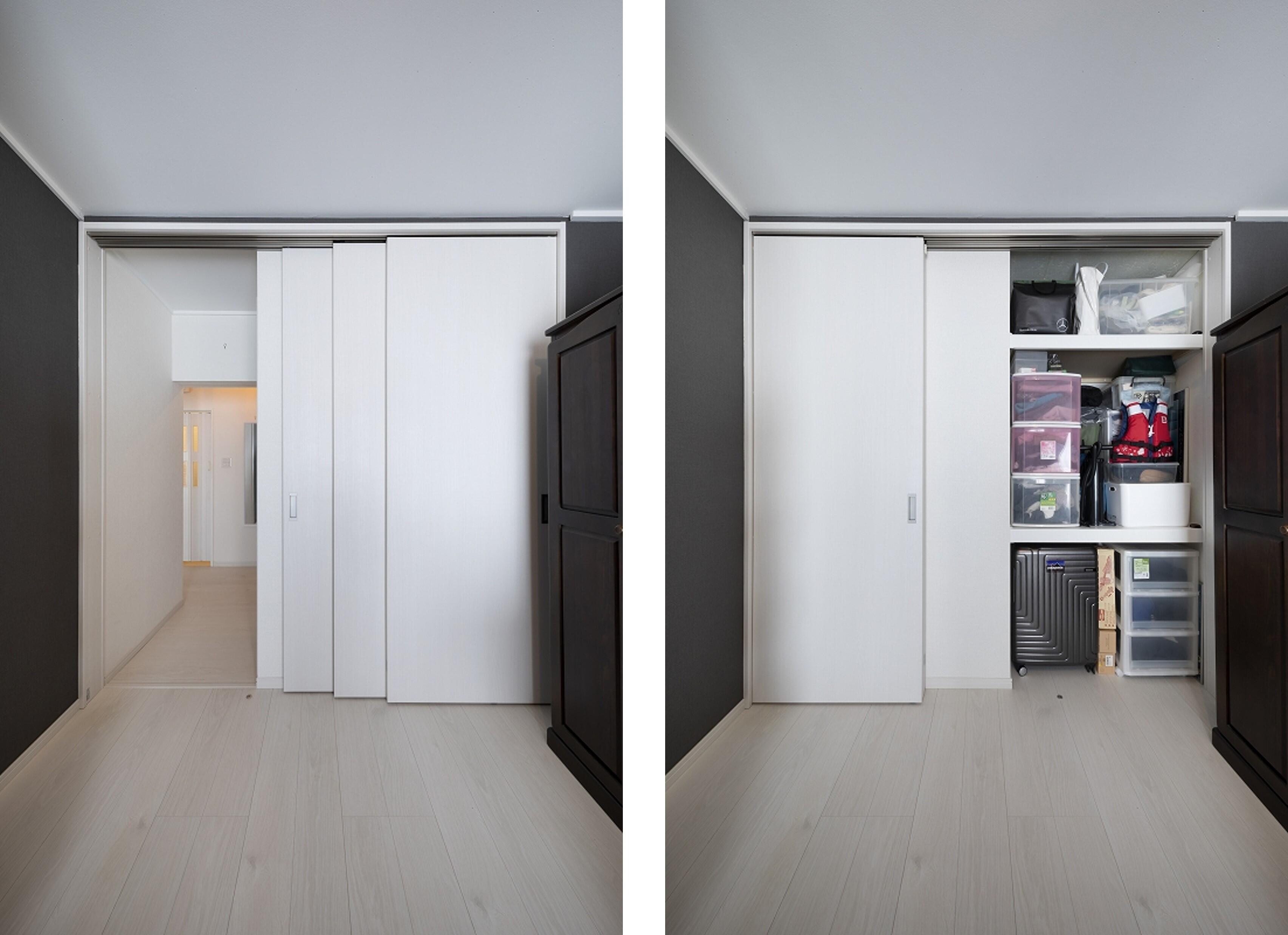 まだ小さいお孫さんのこと、そして将来のご自身たちのことを考え、段差も扉も極力なくしたワンルーム風の空間にしたいとのご希望がおありでした。そこでリビングと和室を一続きにする際、床の段差と併せて間仕切り壁も撤去。襖を外しても残っていた下がり壁がなくなり、すっきりと開放的な空間になりました。ロールスクリーンやカーテンで、必要に応じて仕切ることが出来るようにしています。