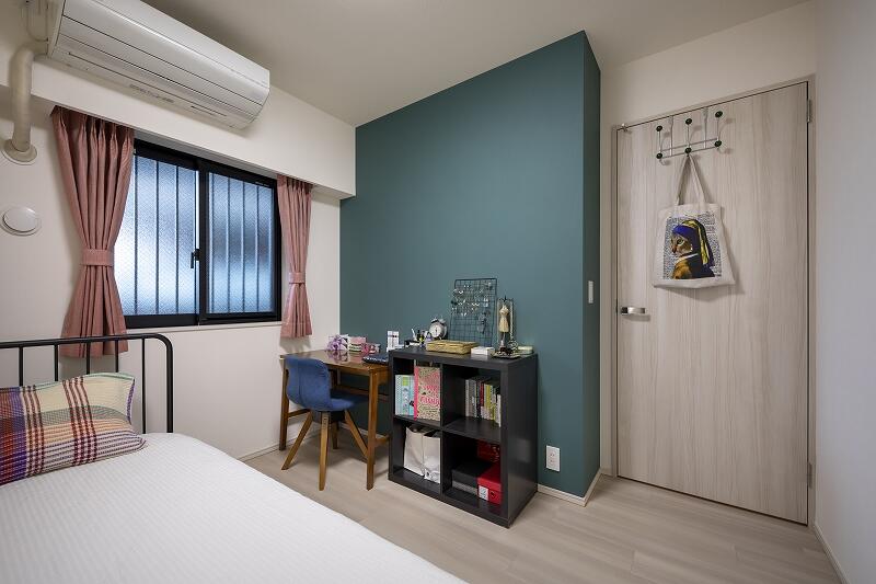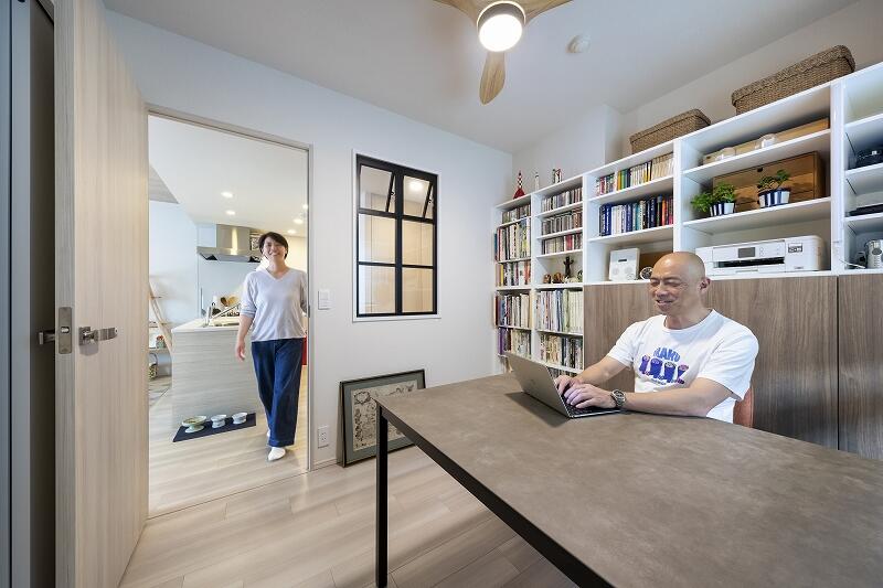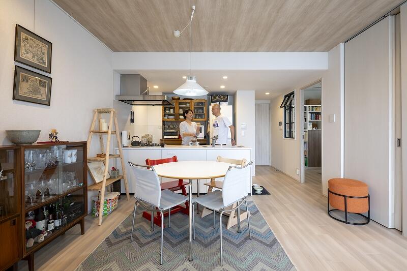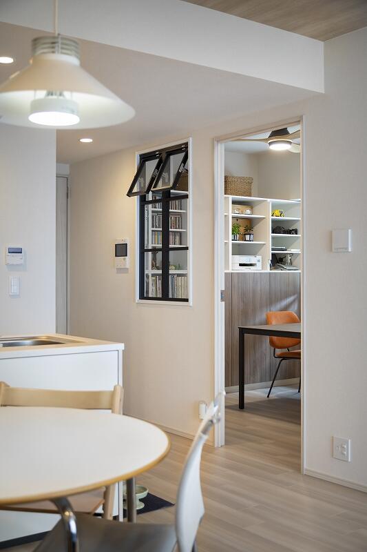 ご要望は、家族みんなで共有でき、勉強、仕事、DIYなどの途中でいちいち片付けなくてよい作業部屋=“コモンルーム”をつくるというユニークなもの。担当者は、誰かが片付けるのではなく、みんなが心地よく過ごせる環境をそれぞれが適度に整出る、学校の図書館や美術室が頭に浮かんだといいます。集中できる場所を共有する、という家族の新しい関係性を感じさせるアイデアに共感し、Y様ご夫妻の描いておられるイメージに沿ってキッチン横の洋室に、隣の部屋の収納を取り込んだ大型の物入、壁一面の本棚を設け、ブラックフレームの室内窓を取り付けることに。また、リビングダイニング空間の天井を木目柄にしたいとのご要望には、お嬢様のお部屋の壁紙と併せて、自らショールームを回りたくさんのサンプルを見比べてお選びになったもので貼り替えさせていただきました。