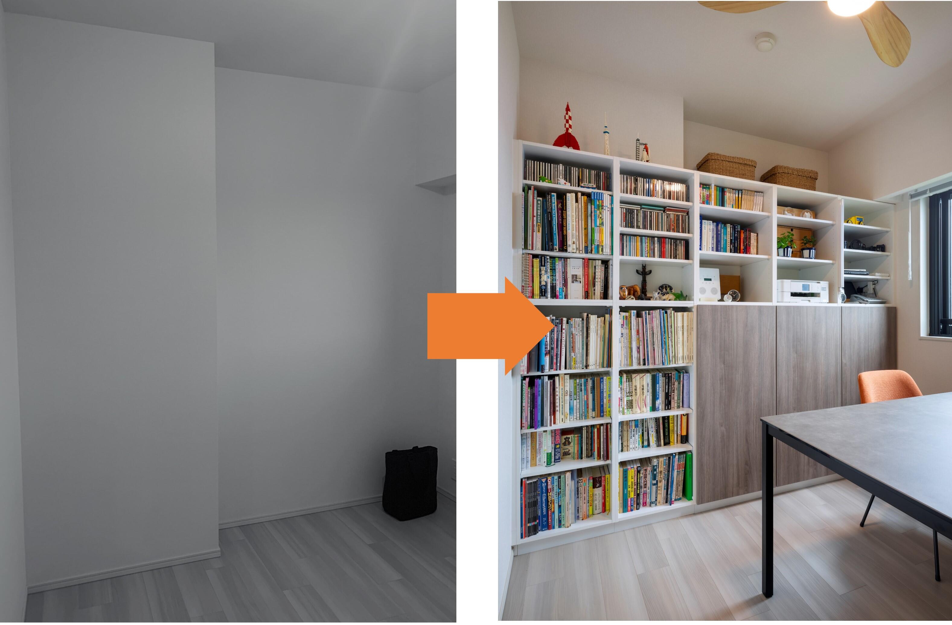 ご主人様が“コモンルーム”に造り付けの本棚を希望しておられたので、長谷工リフォームオリジナルセミオーダー収納家具“RASHIKU(ラシク)”を提案させていただきました。専任スタッフを交えてオンラインで打ち合わせをし、現地の状況に合わせて幅、高さ、奥行をそれぞれ1㎜単位でカスタマイズ。壁に段差、梁があるスペースに無駄なくすっきり納めました。
