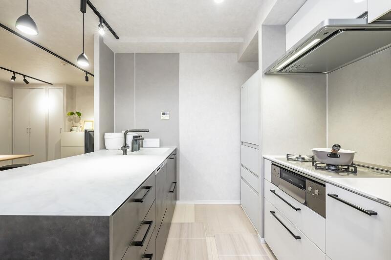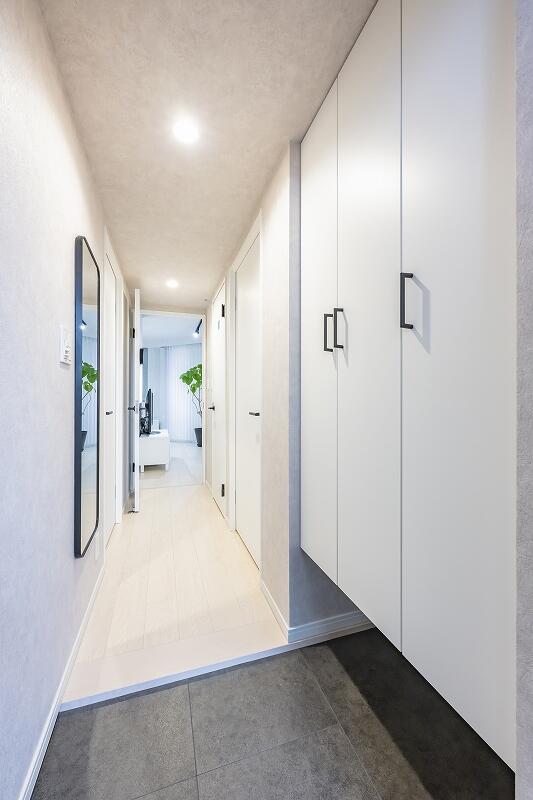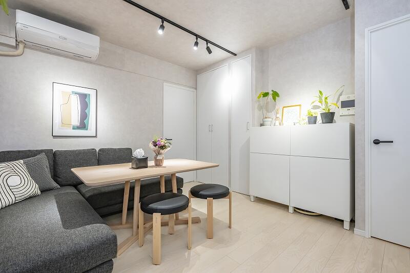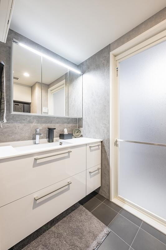 グレーを基調としたモノトーンが美しい A様邸。リフォーム前はブラウン系のドアやフローリングに合わせたインテリアで、全く違う雰囲気だったそうです。9年前に「室内はリフォームすればいいから」と立地条件を優先して購入された中古マンションで、「いつかリフォームしたい」という思いを温め、お子様の進学を機に念願のリフォームに着手することを決意されました。