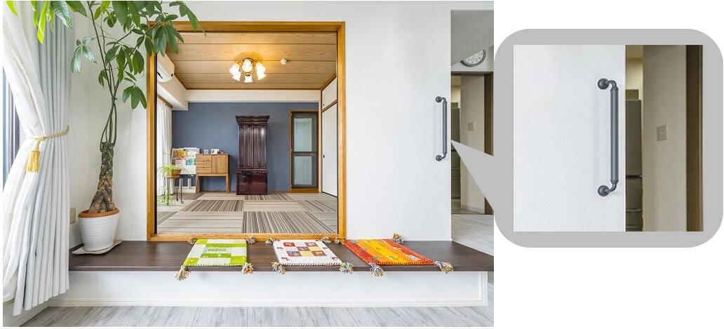 また、リビングの手すりについても、単なる機能性だけでなく空間のアクセントとなるよう、アイアン調のデザインをご提案し、そこから照明や襖の色味まで統一感を持たせることができました。