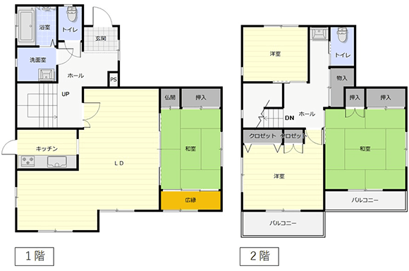 - リビングダイニング、キッチン、和室、洋室、水まわり、
