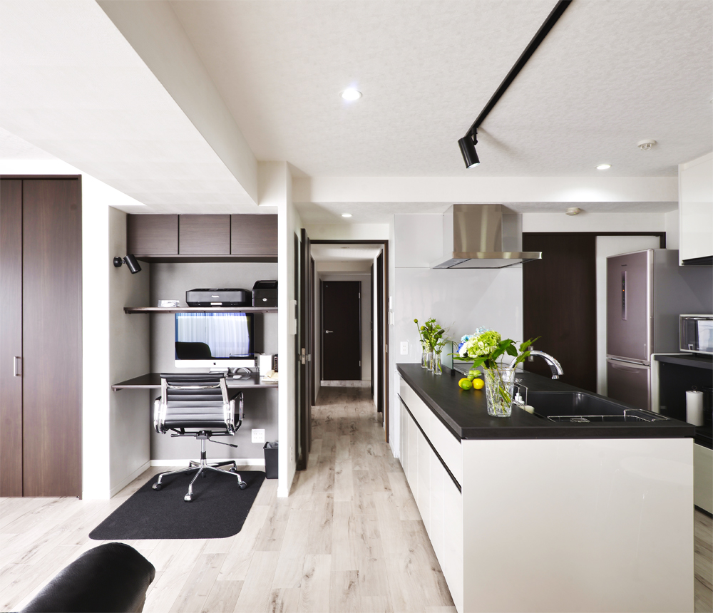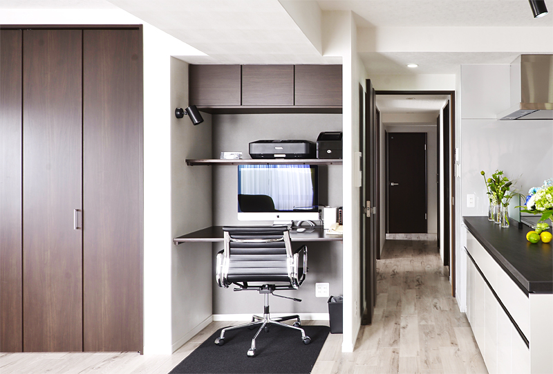 パソコン及びプリンター等の周辺機器を置く前提で設計。スペースを有効に使えるよう照明は壁付けにしています。
