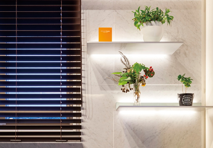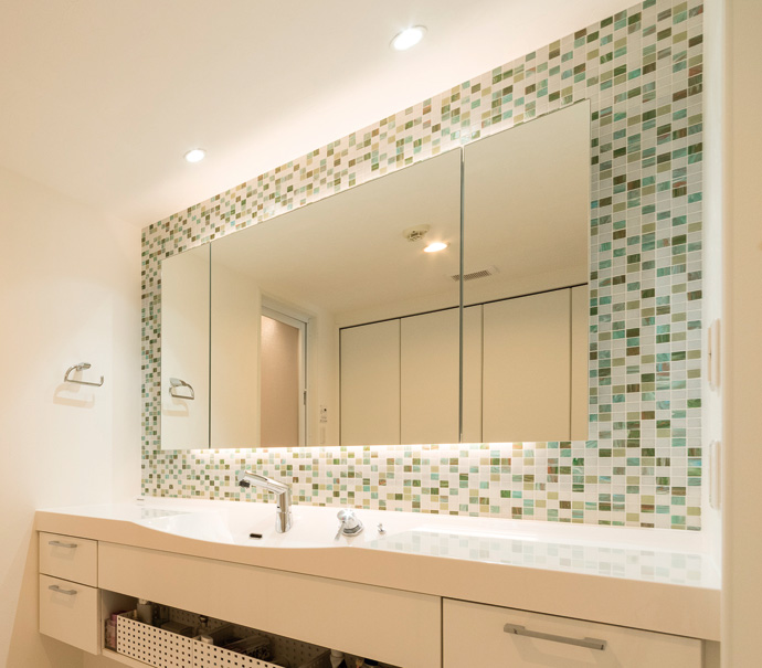 ミラーの上下に間接照明を入れることで、やわらかな光で顔に影をつくらず、メイクしやすい空間となります。