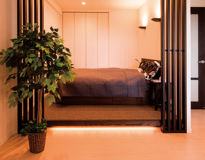 ベッドコーナーを一段上げて間接照明を入れることで、柔らかな光で空間を間仕切ることができました。