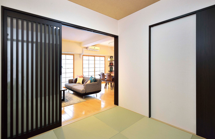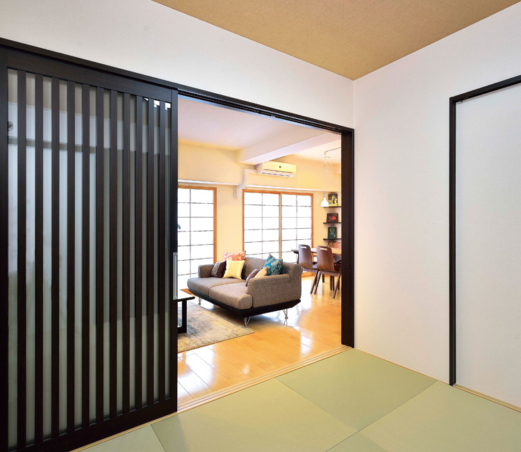 和室から格子戸越しにほっこり眺めるリビングの景色が奥様の一番のお気に入り。 真新しい畳は、クッション性にも優れ、まだ小さなお孫さまと一緒に遊ぶときも安心です。