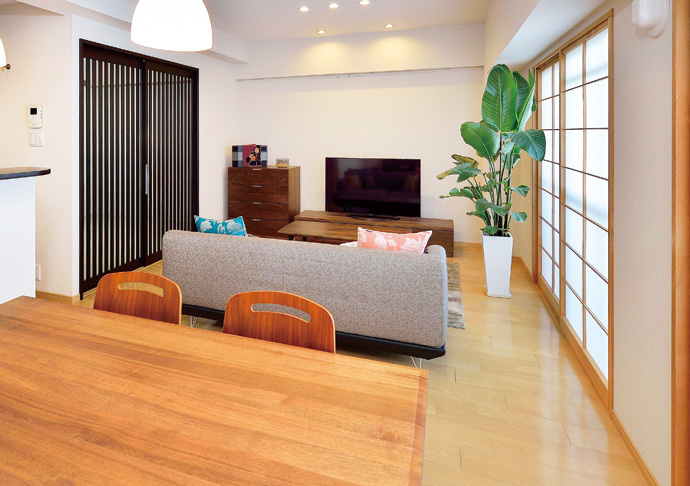 障子をリビングに取り入れることでカーテンとはちがった陽だまりができ、断熱の効果も得られ快適なリビング空間になりました。