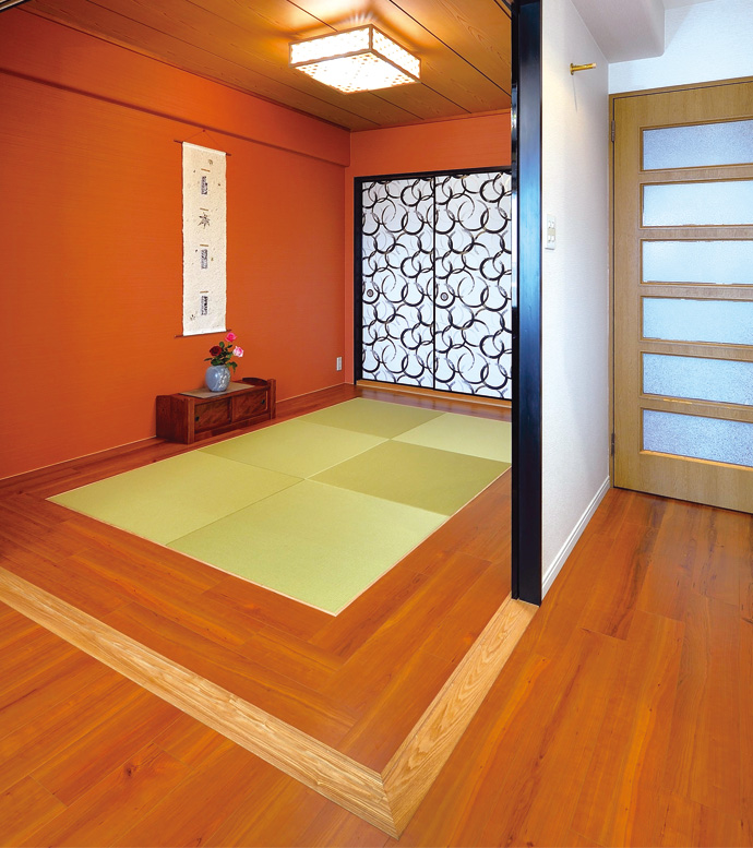 非日常が味わえる斬新なこだわりの和空間。リビングとの段差もなくなり行き来もより安全になりました。市松に敷きこまれた畳の上でゆっくり寛ぐのがご主人の至福のひととき。