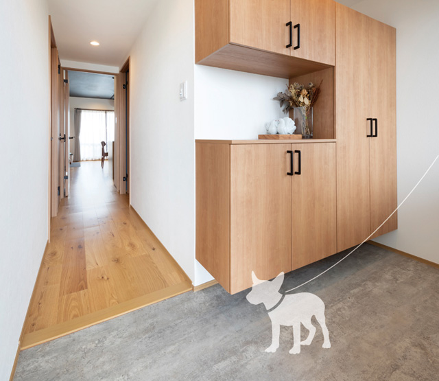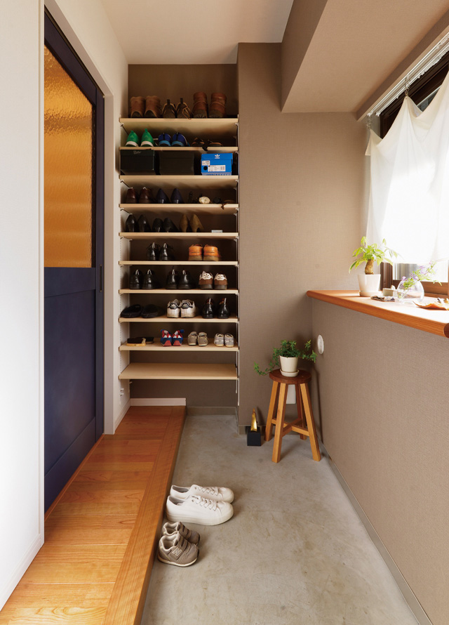 小さいお子さんが座って靴を履けるように、土間とフローリングのバランスを考えました。