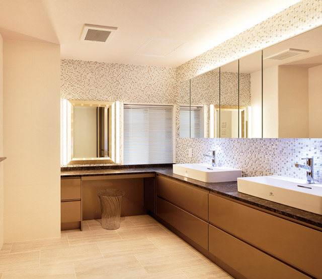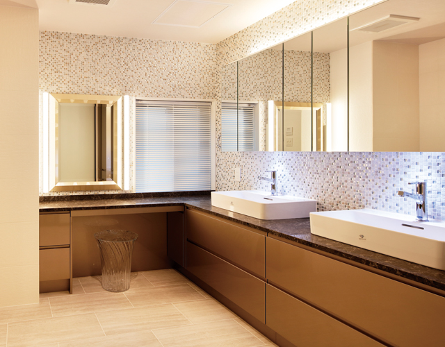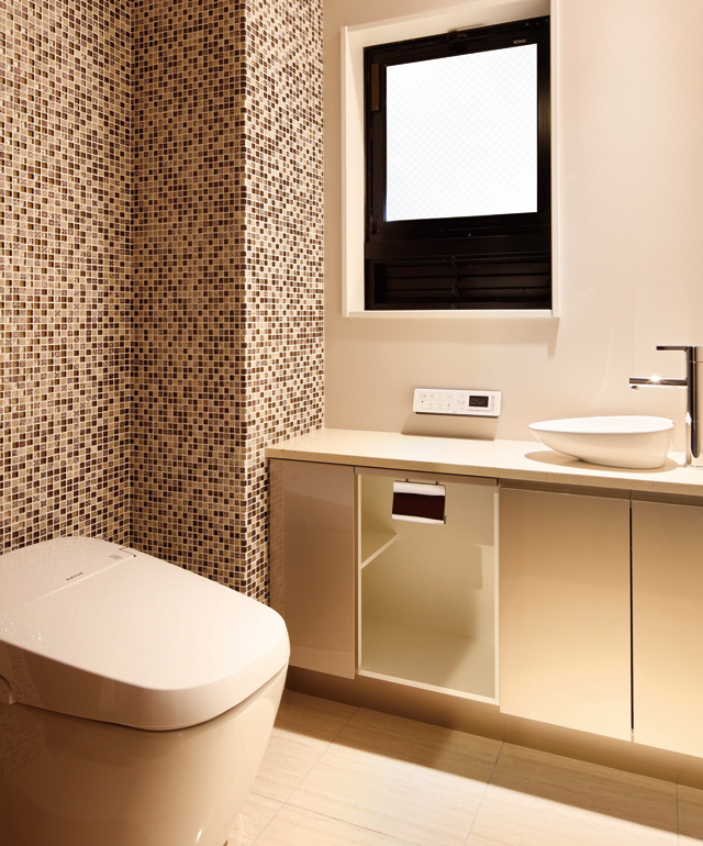 透明感あるブラウンのモザイクタイルでシックな雰囲気に。