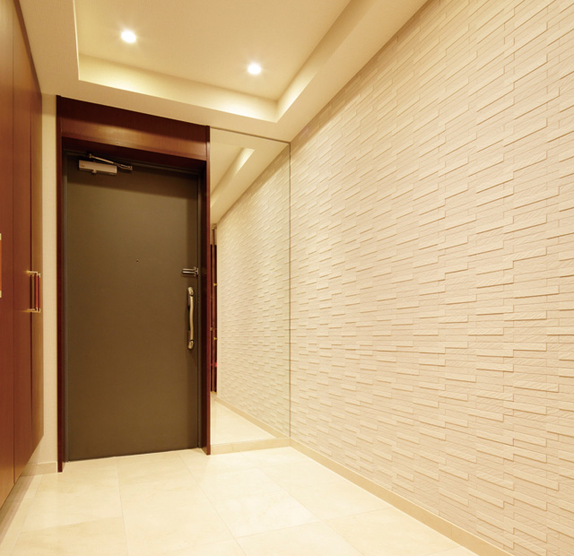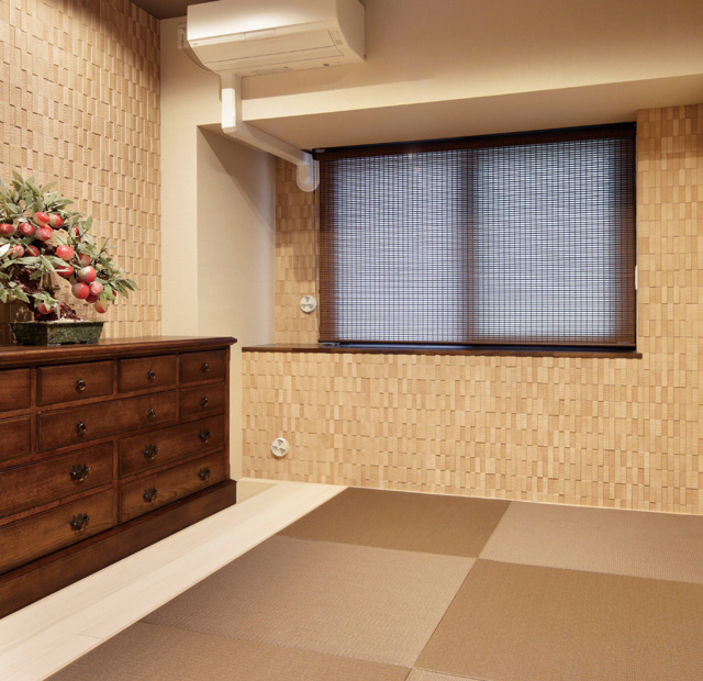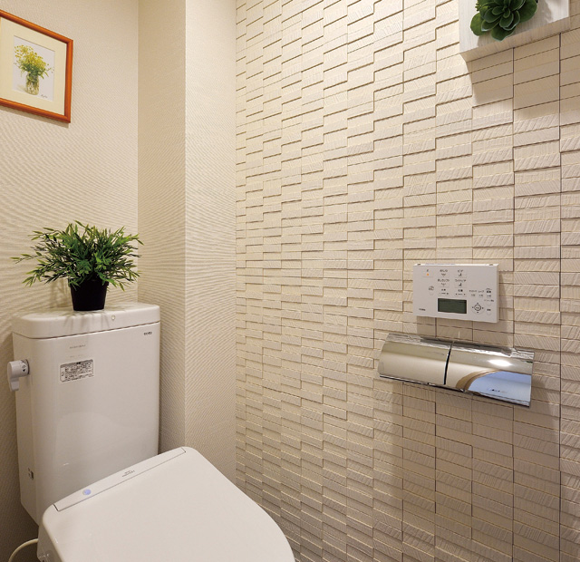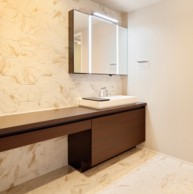 床と壁を大判ハニカムタイルで統一、広がりあるデザインに。