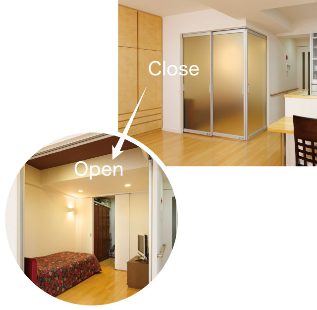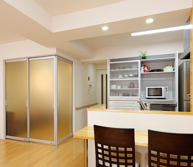 バリアフリーで居室とリビングを行き来できるように、間仕切りには床レールのない上吊建具を使用しています。また、必要なところには手摺も取付けています。床は電気式床暖房で動きやすく快適な環境を実現しています。
