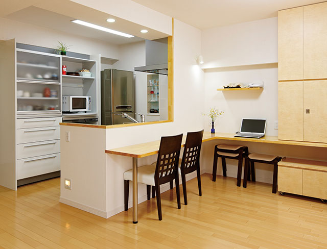 キッチンを対面式に変更し、食卓を兼ねたL型カウンターを取付けました。カウンターの一角にPCコーナーとお仏壇コーナーを設けて、必要なものを必要な場所へコンパクトにまとめています。
