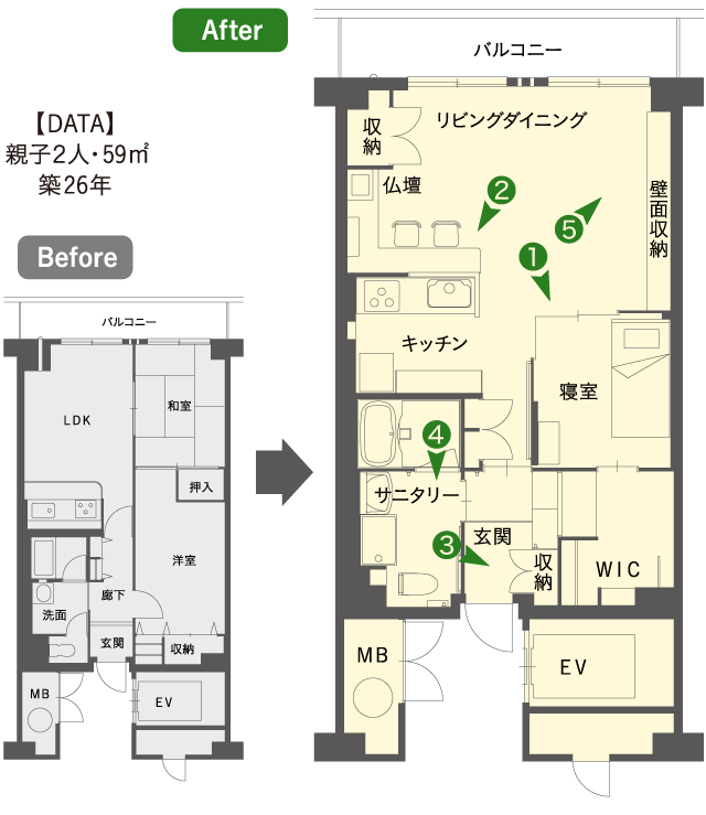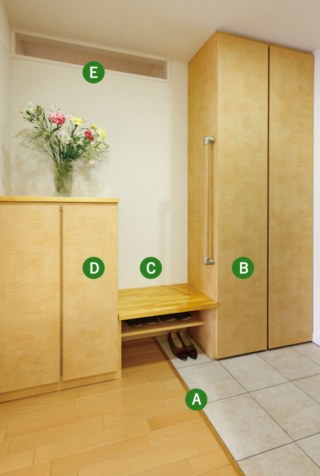 A段差を解消してフラットに B手押しカート等のトール収納 C腰掛用のベンチと手摺を設置 Dベンチの横に下駄箱を設置 Eウォークインクローゼットへの通風口