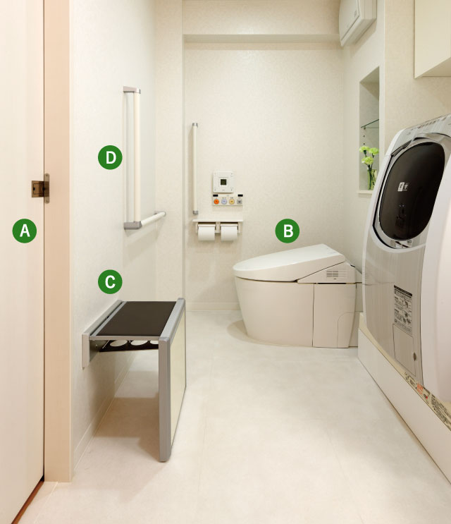 A洗面室入口に引戸を新設しトイレと洗面室の壁をなくして空間を一体化、介助が必要になった際も充分なスペースを確保 Bタンクレストイレで空間をスッキリと C脱衣スペースに折りたたみ式のベンチを設置 D立ち座りや移動のための手摺を設置