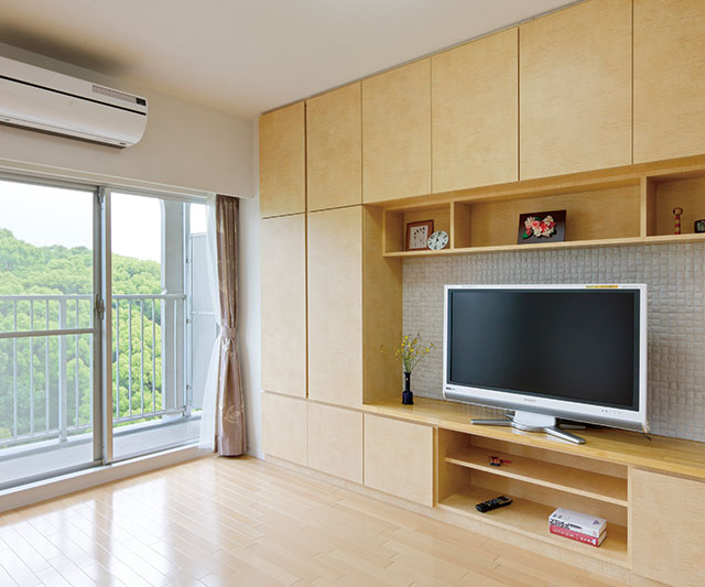 広くなったリビングの壁一面に造り付けの収納を造作しました。 たっぷり収納できるため、部屋が散らかりません。