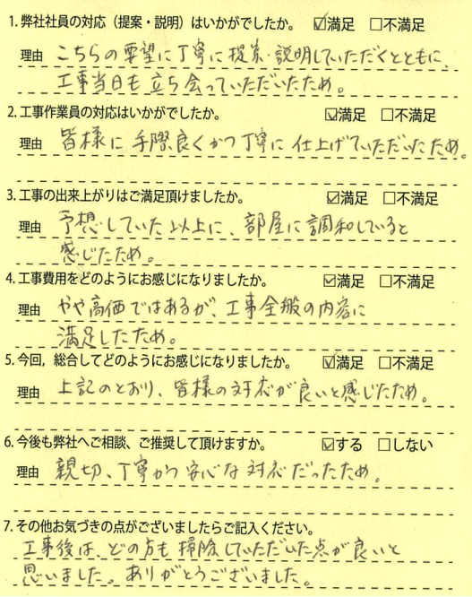 こちらの要望に丁寧に提案、説明していただくとともに工事当日も立ち会っていただいたため