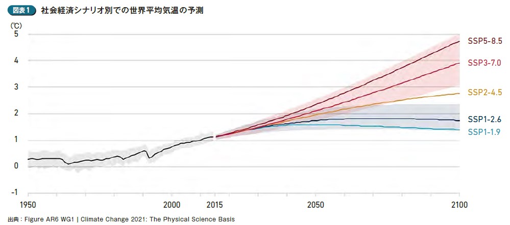 「疑う余地がない」とされている。報告書では5つの社会経済シナリオ(SSP)(注1)を示し、世界の平均気温を予測しているが、