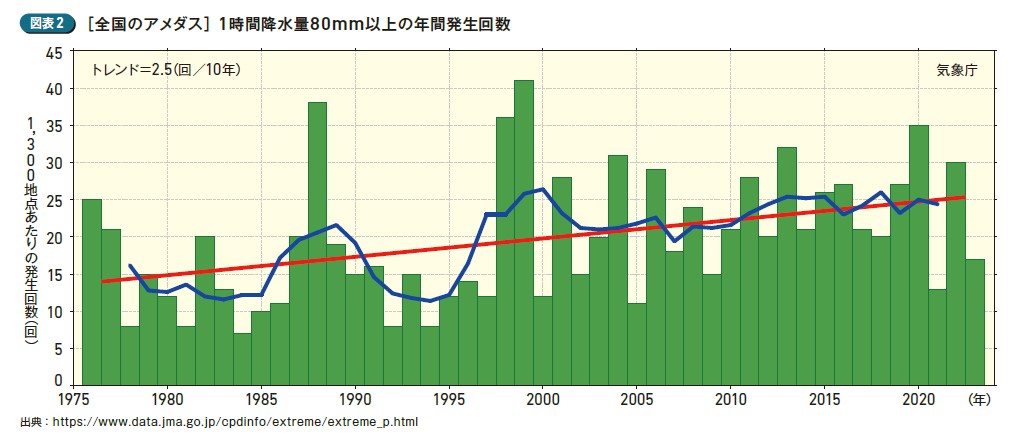 される。ここでは近年頻発化・激甚化が懸念されている日本の水害について概観したい。日本の降水量の経年変化を見ると、