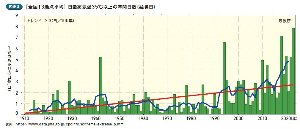 「猛烈な雨」とされる1時間降水量80mm以上の全国での年間発生回数は明確に増加している(図表2)。また、全国の日最高気温が