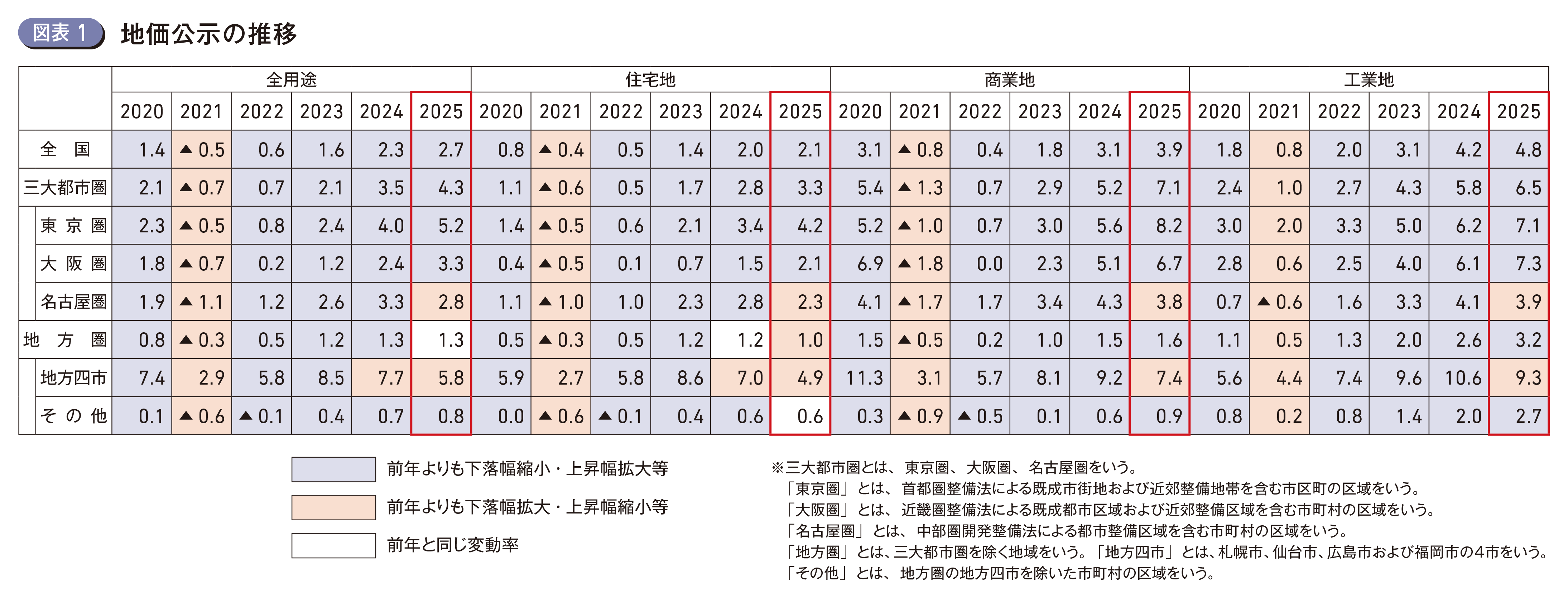 国土交通省が3月18日に公表した「2025年地価公示」によれば、全用途の全国平均は2.7%上昇し、これで4年連続の上昇となった。全国の地価は景気が緩やかに回復している中、地域や用途により差があるものの、三大都市圏では上昇幅が拡大し、地方圏でも上昇傾向が継続するなど、全体として上昇基調が続いている(図表1)。