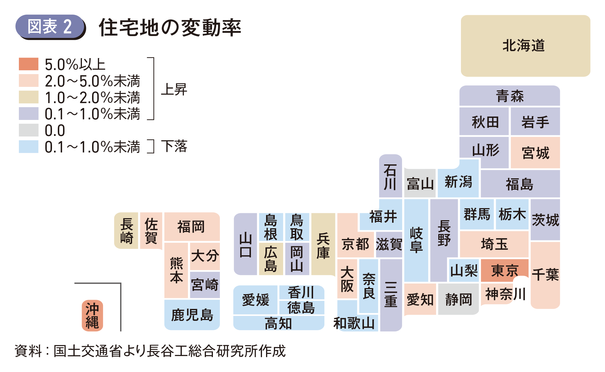 住宅地の全国平均は2.1%上昇し、これで4年連続の上昇となったが、その勢いは緩やかだった。プラスの変動を示した都道府県は30都道府県で、前年よりも1県増加(滋賀県が新たにプラスに転じた)した。一方でマイナスとなったのは15県で、前年よりも2県減少した。