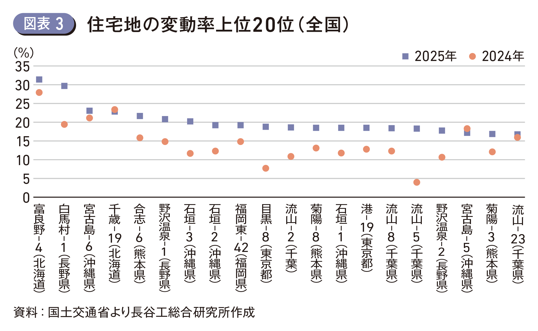 観光需要・工場進出を背景とし、地方経済の活性化が地方の地価上昇に寄与している。また、低金利環境が住宅需要を後押しし、都市部でも引き続き高い上昇がみられている。上位20位の地価上昇地点には、東京圏から6地点が含まれている一方で地方圏が14地点を占めている。特に、白馬村(長野県)、目黒(東京都)、流山(千葉県)の上昇幅は2024年に比べ10ポイント以上に達している(図表2)(図表3)。