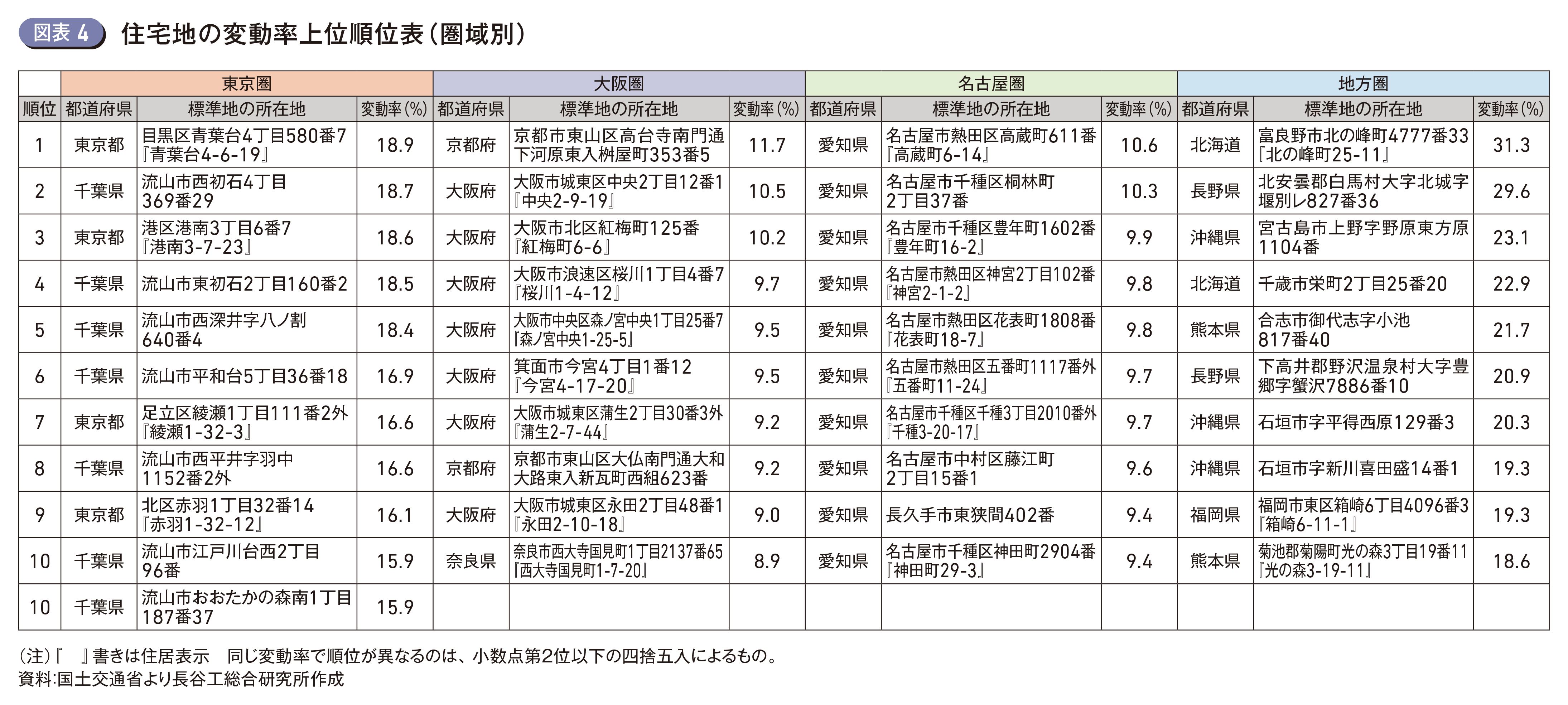 圏域別の住宅地上昇率では、特に地方圏の上昇幅が顕著で、30%超となる地点も見受けられた。東京圏・大阪圏・名古屋圏では、利便性が高く住宅需要が旺盛な地点が上位にランクインしている。一方、地方圏ではリゾート・観光地が上位を占めており、これらの地域の地価上昇が目立っている(図表4)。