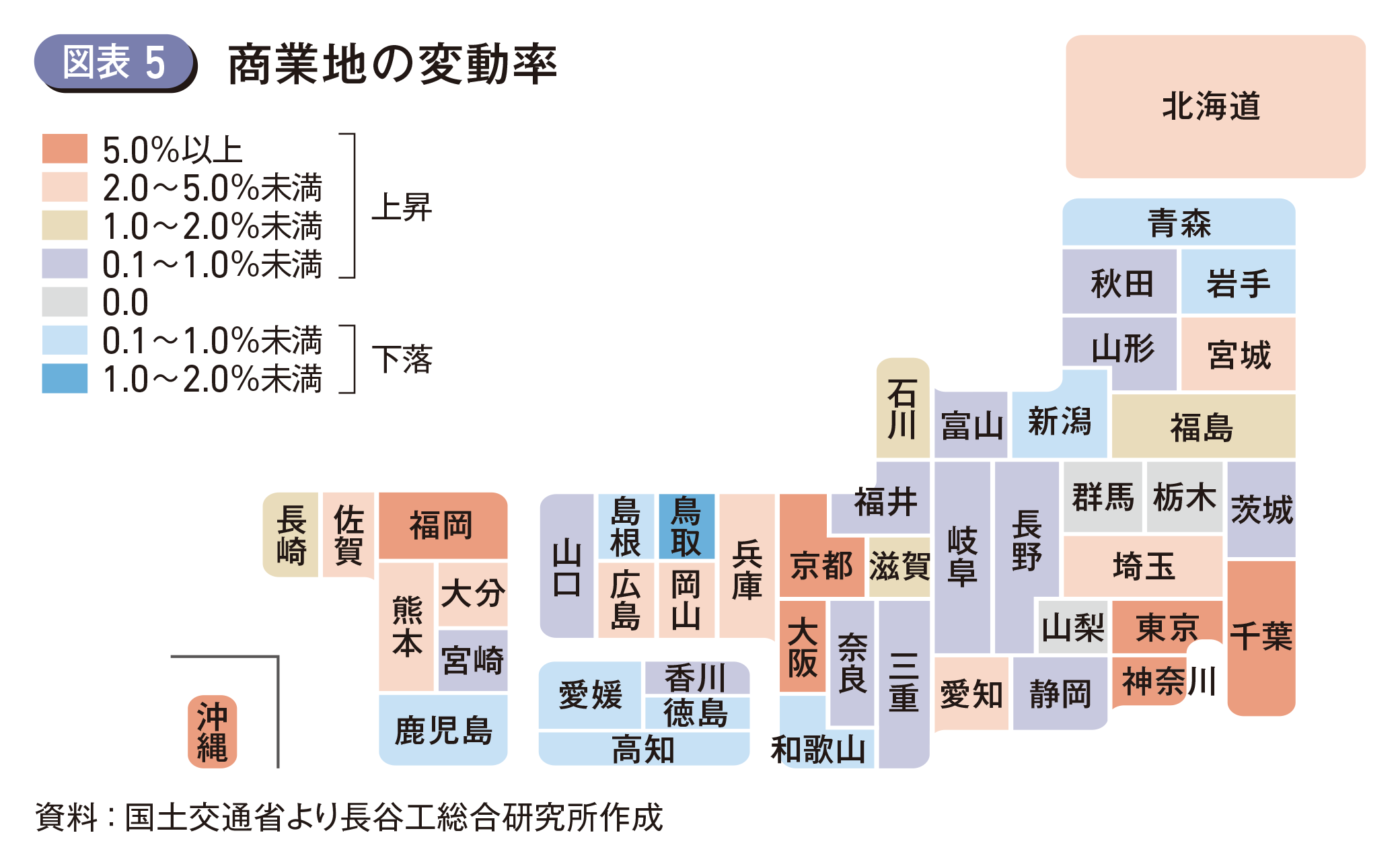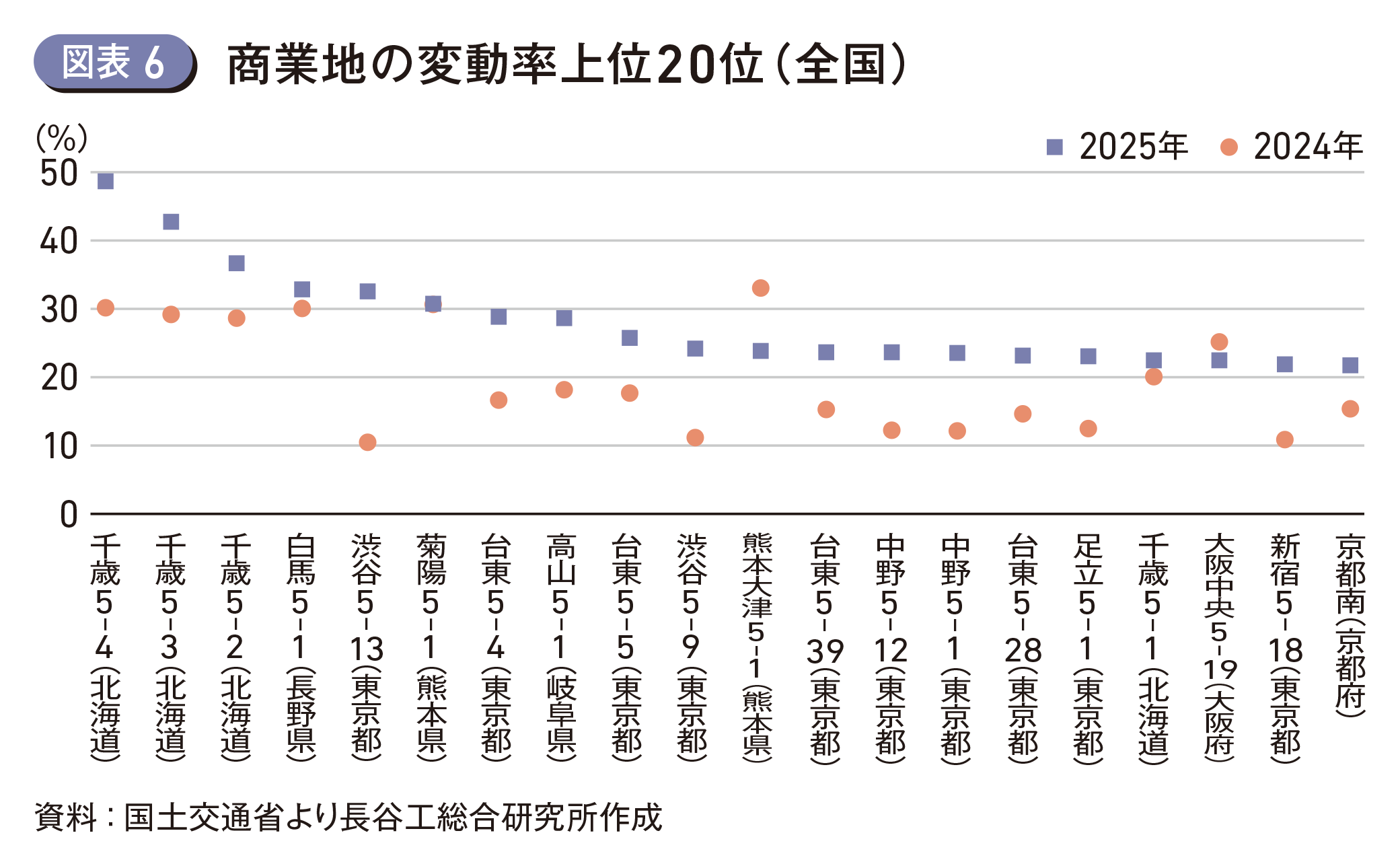 業地の全国平均は3.9%上昇し、これで4年連続上昇、かつ上昇幅が拡大した。プラスの変動を示した都道府県は34都道府県で、前年よりも5県増加(山形県、富山県、長野県、香川県、宮崎県が新たにプラスに転じた)。一方でマイナスとなったのは10県で、前年よりも5県減少した。駅周辺などマンションとの需要競合がみられる地域は、高い上昇率を示しているほか、リゾート・観光地では観光需要を背景に引き続き大幅な上昇率を示している。上位20位の地価上昇地点には、東京圏から10地点、大阪圏から2地点が含まれている一方で、地方圏が8地点を占めている。特に千歳市(北海道)は工場進出、台東区浅草(東京都)はインバウンドによる観光客増加を背景としたホテル・店舗需要が旺盛であり、2024年に比べ上昇幅が10%以上に達している(図表5)(図表6)。