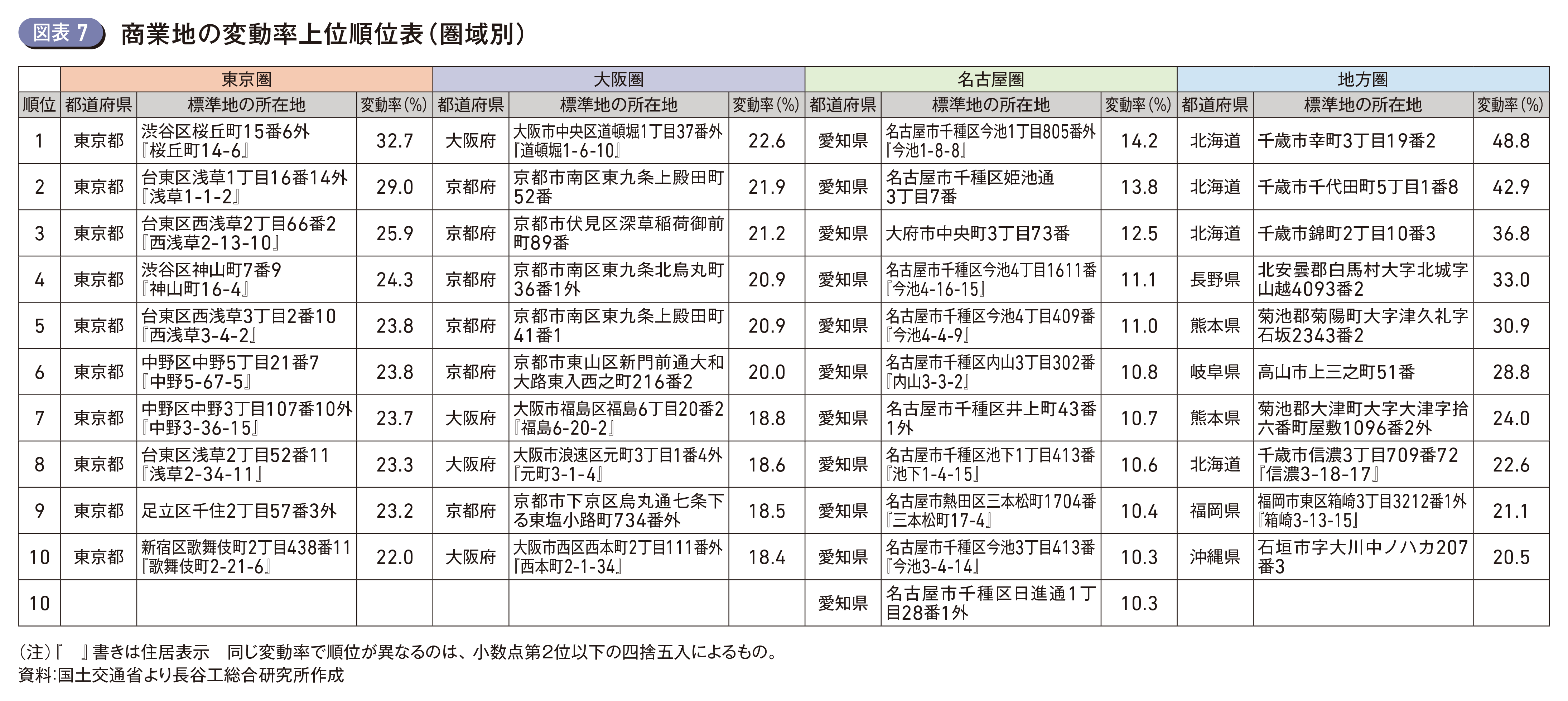 圏域別商業地の上昇率上位では、特に地方圏の上昇幅が大きく観光地・繁華街のほか工場建設が開始された地域において30%超となる地点もみられた。上位10位には東京圏が4地点のほかは地方圏が6地点を占めた。東京圏では観光・店舗需要が旺盛な地点、地方圏ではビジネス街やリゾート地が上位を占めた(図表7)。