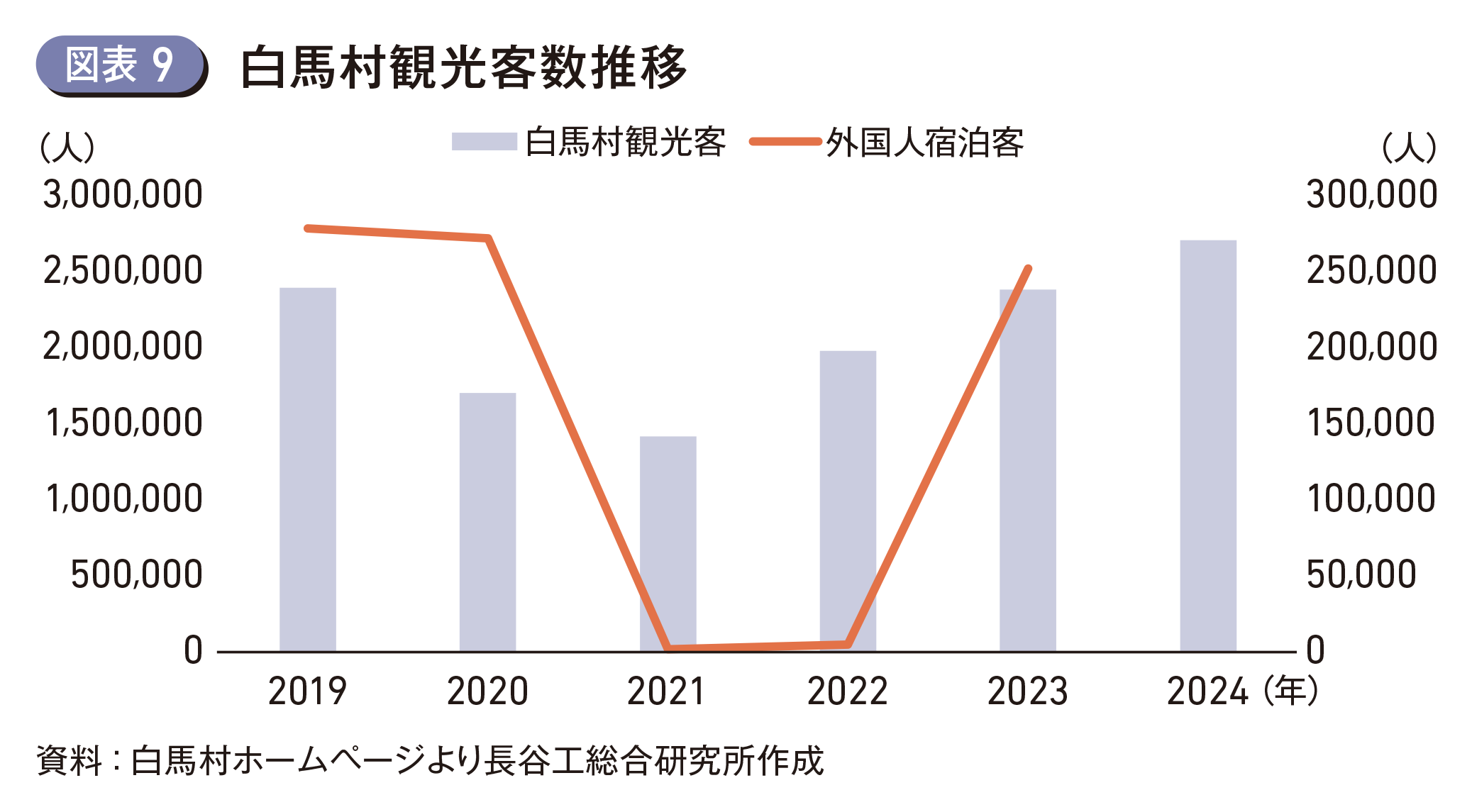 全国の観光・リゾート地として、長野県北安曇郡白馬村と沖縄県石垣市では、住宅地と商業地の地価が上昇。2019年からの地価動向と観光客数の推移をみると、白馬村では特に2023年からの外国人宿泊数が増加し、地価の上昇が顕著となった。白馬村の住宅地は以前から国内外の観光客を引き寄せていたが、コロナ禍が明けてから、外国人観光客数が回復し、商業地ではホテルや店舗の需要が高まり、地価が大幅に上昇した(図表8)(図表9)。