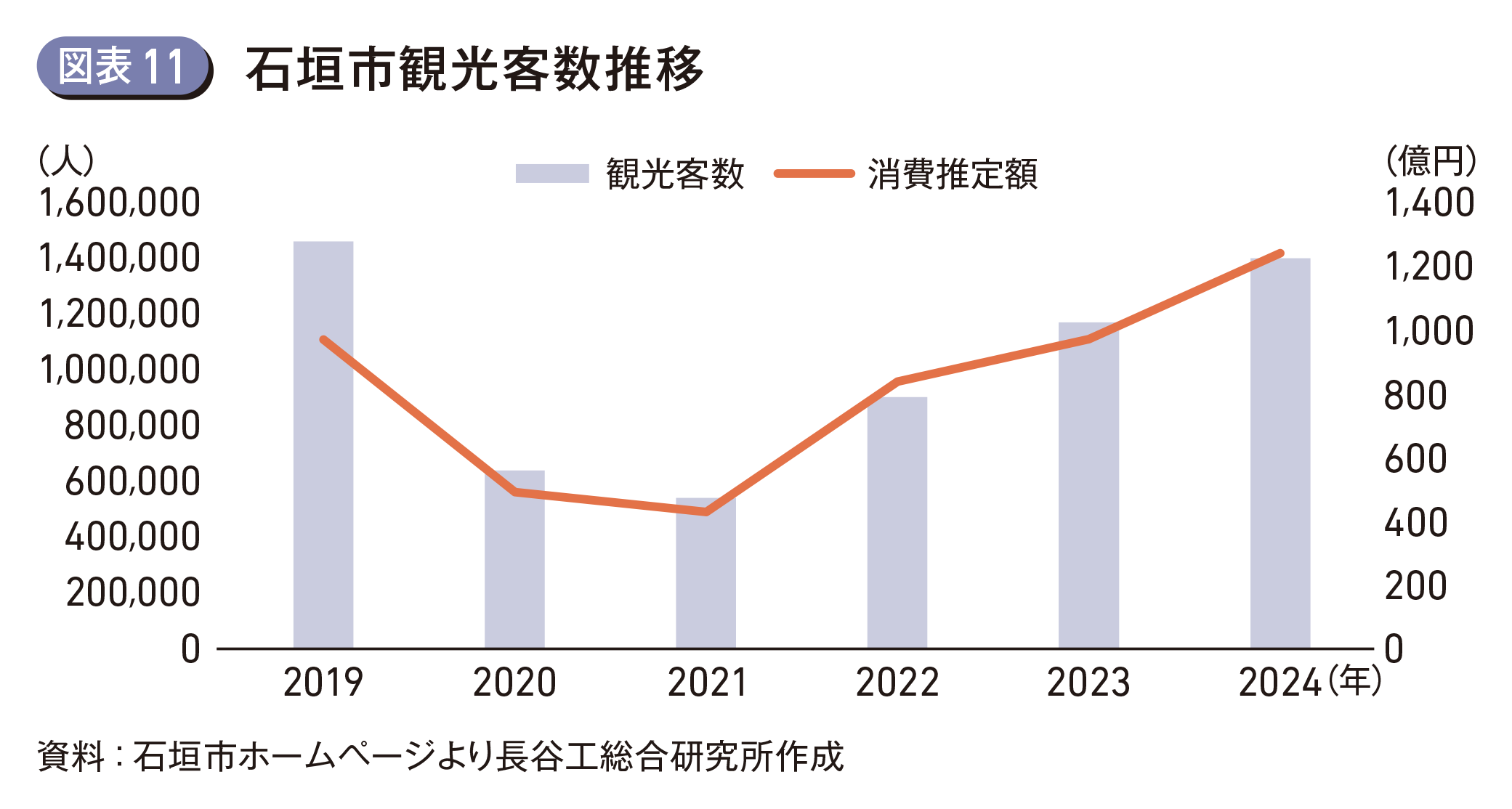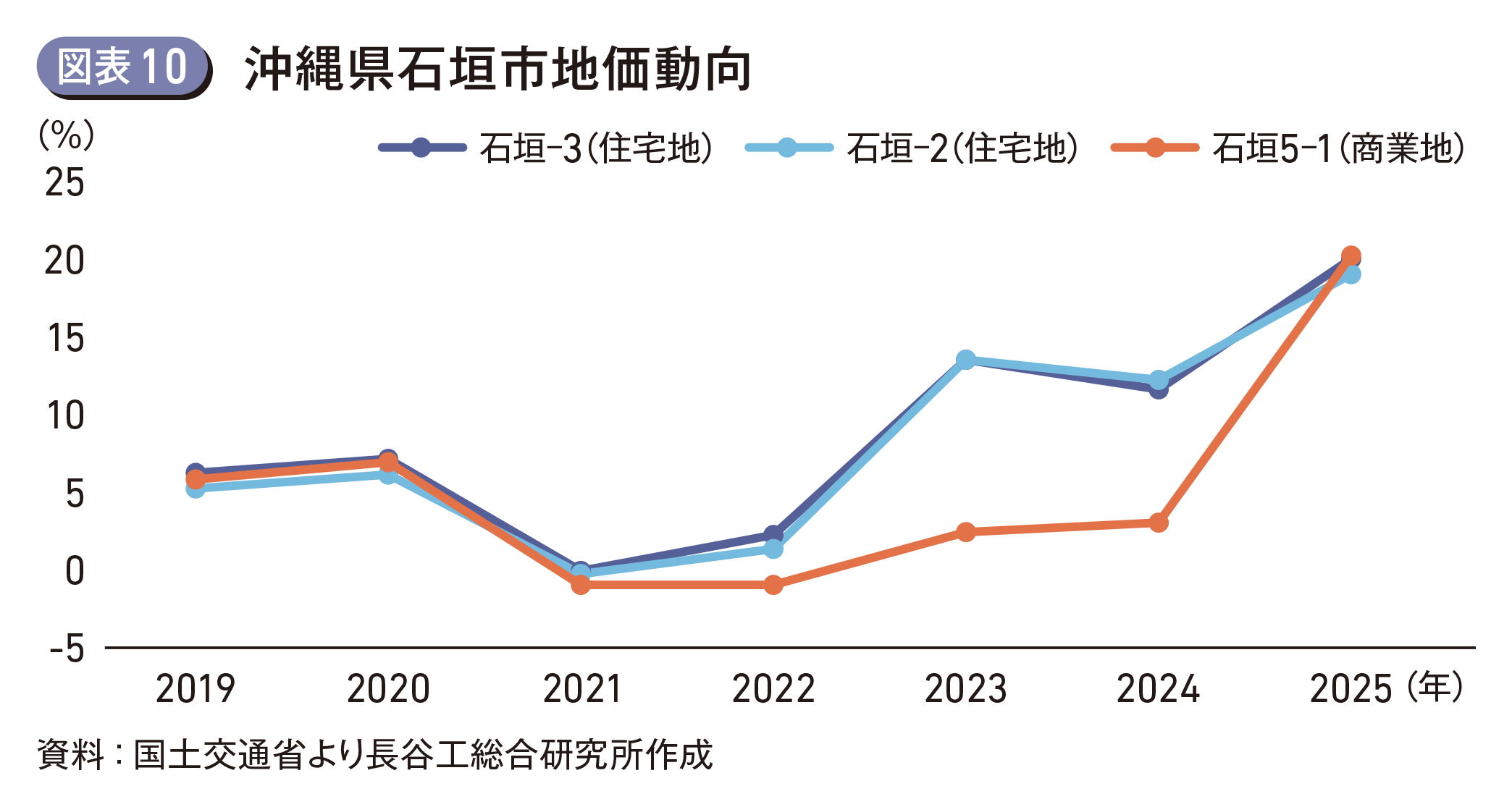 一方、石垣市でも観光需要による地価上昇がみられ、住宅地は2023年に、商業地は2025年に大幅な上昇を記録した(図表10)(図表11)。