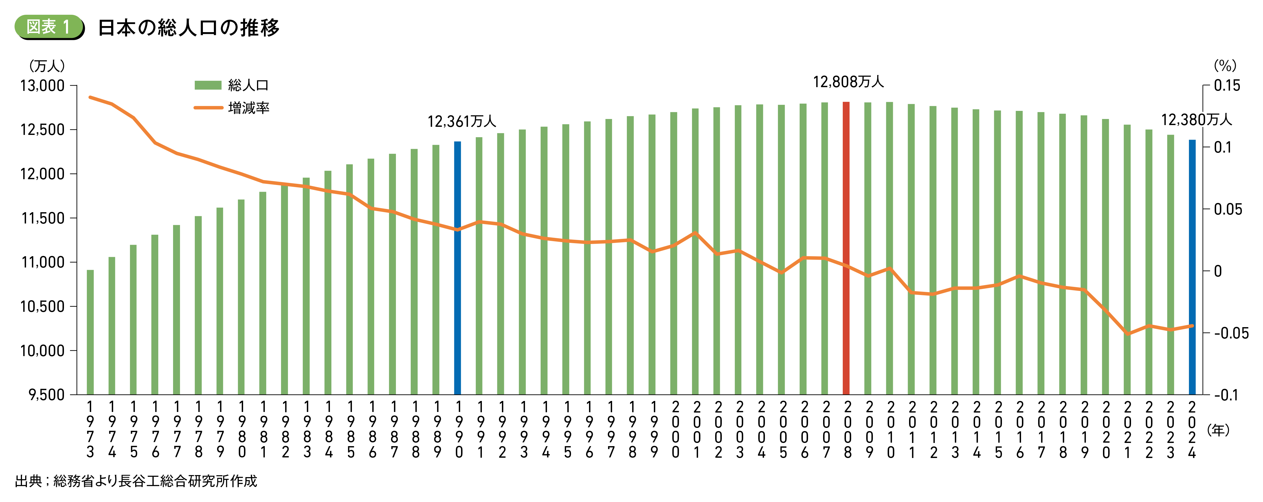 日本の総人口を長期で見ると、1億人を超えたのは1967年で、今から57年前となる。それ以降、2005年に減少に転じる以外は増加が継続し、2008年に1億2,808万人のピークを迎えるが、2011年以降14年連続減少し、2024年には1億2,380万人となった。これは1990年の日本の総人とほぼ同水準(1億2,361万人)で、日本の総人口が約34年前の水準に戻ったことを示している (図表1)。