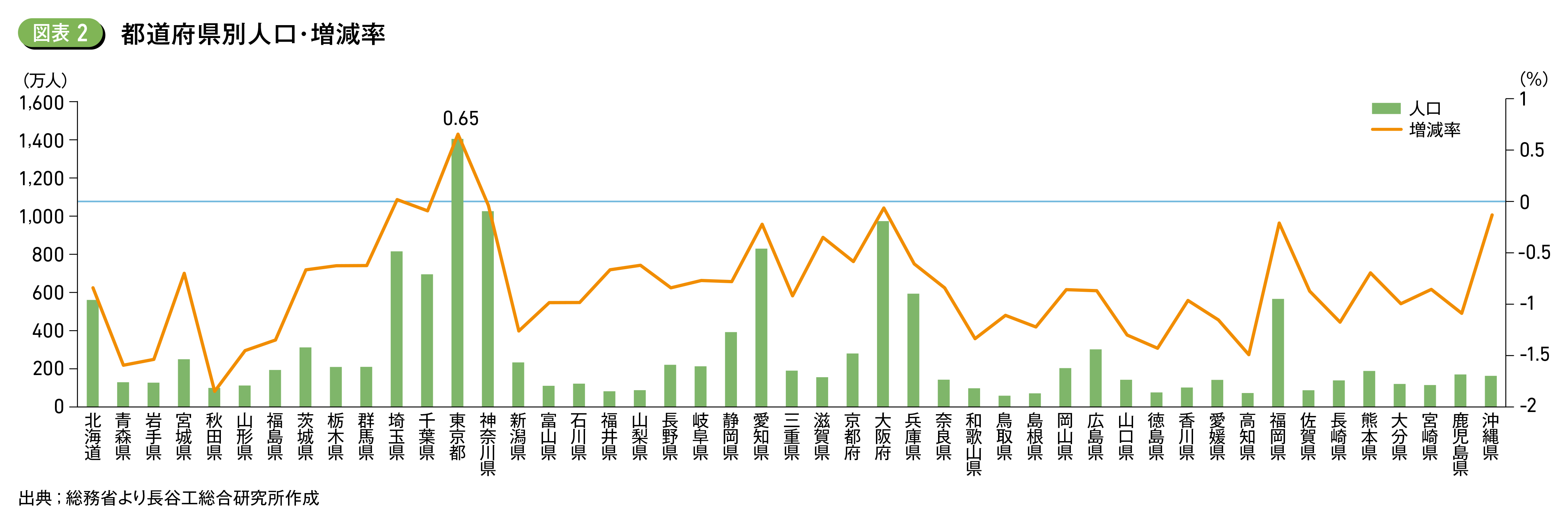 都道府県別の人口では東京都が1,417万8,000人と最も多く、東京都が全国人口の11.5%を占め、東京都の一極集中の傾向は継続。最も人口が少ないのは鳥取県で53万1,000人だった。都道府県別の増減率では、東京都・埼玉県のみが増加し、45道府県は減少した (図表2)。